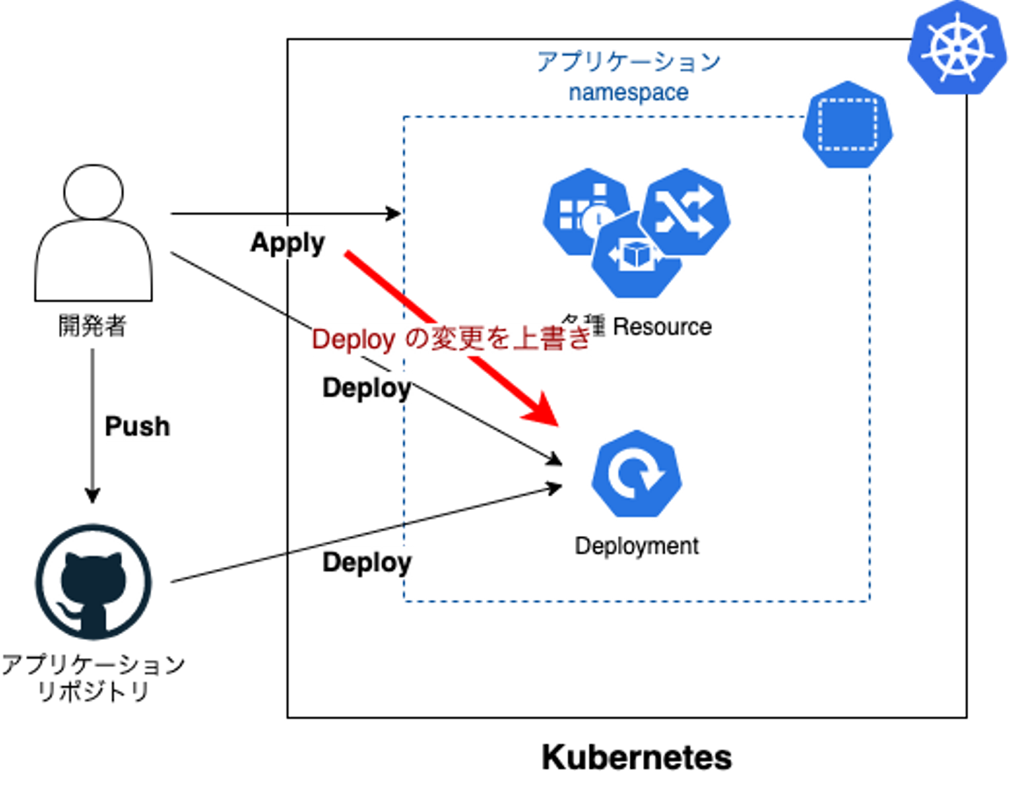 - Deploy は GitHub リポジトリ の k8s manifest に変更を加えず、k8s resource に直接変更を加える作業