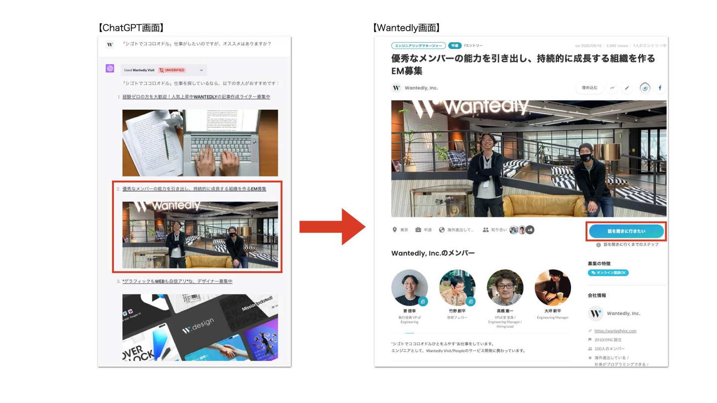 まずユーザーが、ブラウザ版のChatGPT上でプラグイン機能(※1)を有効にしたうえで、当社が提供するプラグインを選択。その後、希望する職種や勤務地、興味関心などを入力すると、Wantedly上に掲載している約10万件の募集(2023年7月時点)の中から、ユーザーにおすすめの募集を一覧表示します。