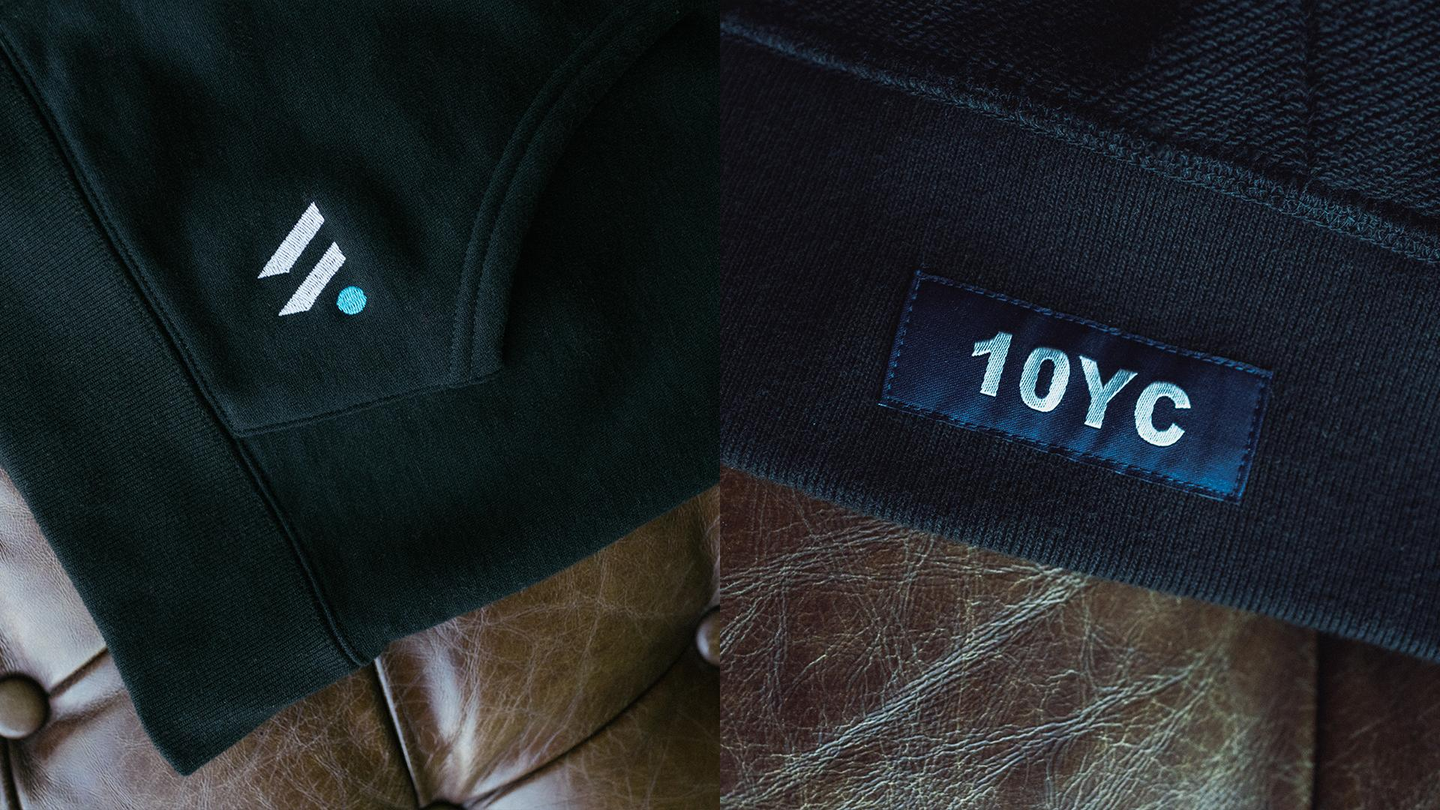 入社時に支給されるパーカー。場所を選ばずに着用できるよう、会社ロゴはシンプルな刺繍で表現したデザインに。ボディは「10年着続けられる服」をコンセプトに据えるブランド「10YC」を起用。