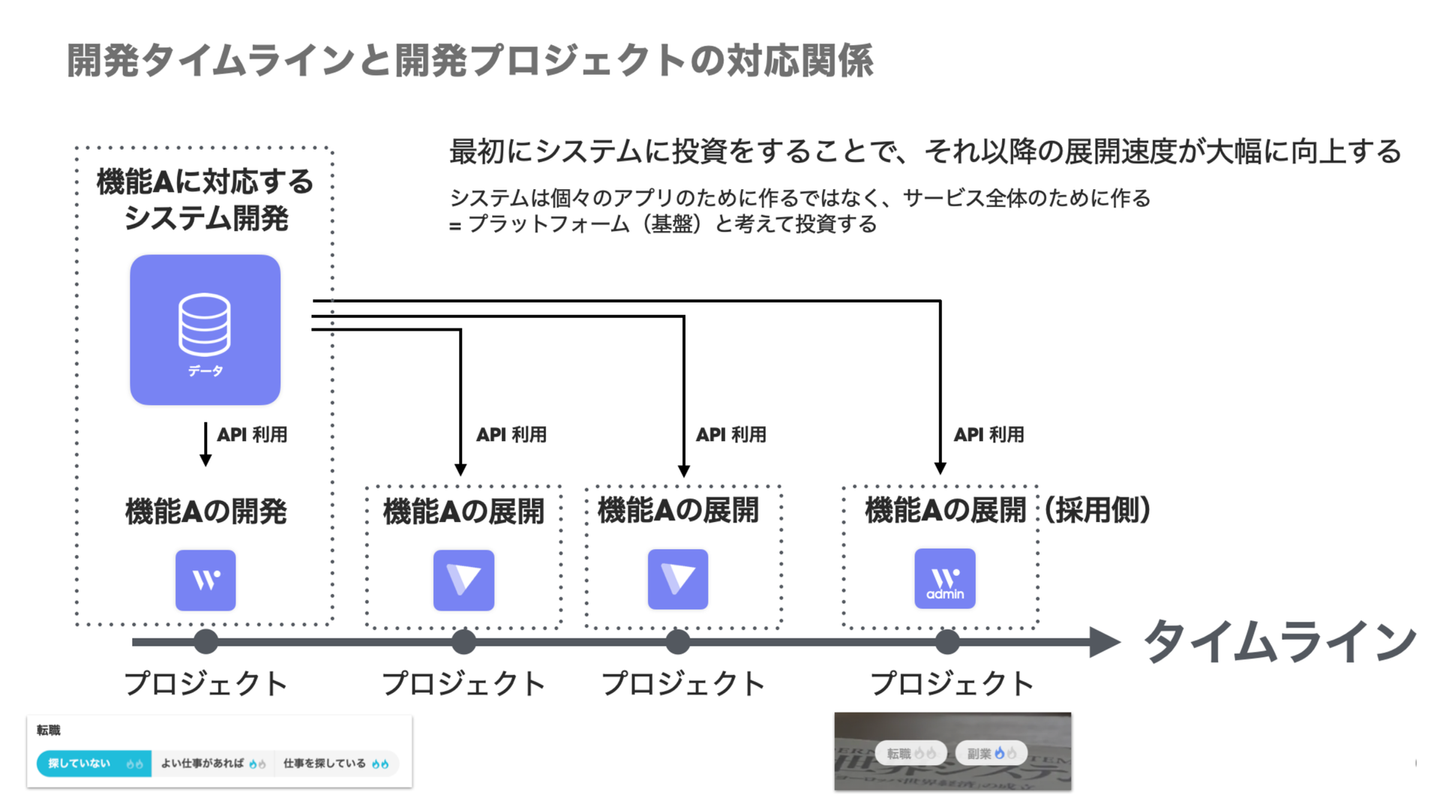 そこで最初にコストをかけてどのアプリでも使えるような汎用的な API に設計することで、それ以降の機能展開速度を向上させることができました。1つのアプリを想定するより 1回のシステムの開発コストは増えますが、2回に分けるとメンバーのアサインの手間もかかるためトータルではコストが低くなりました。
