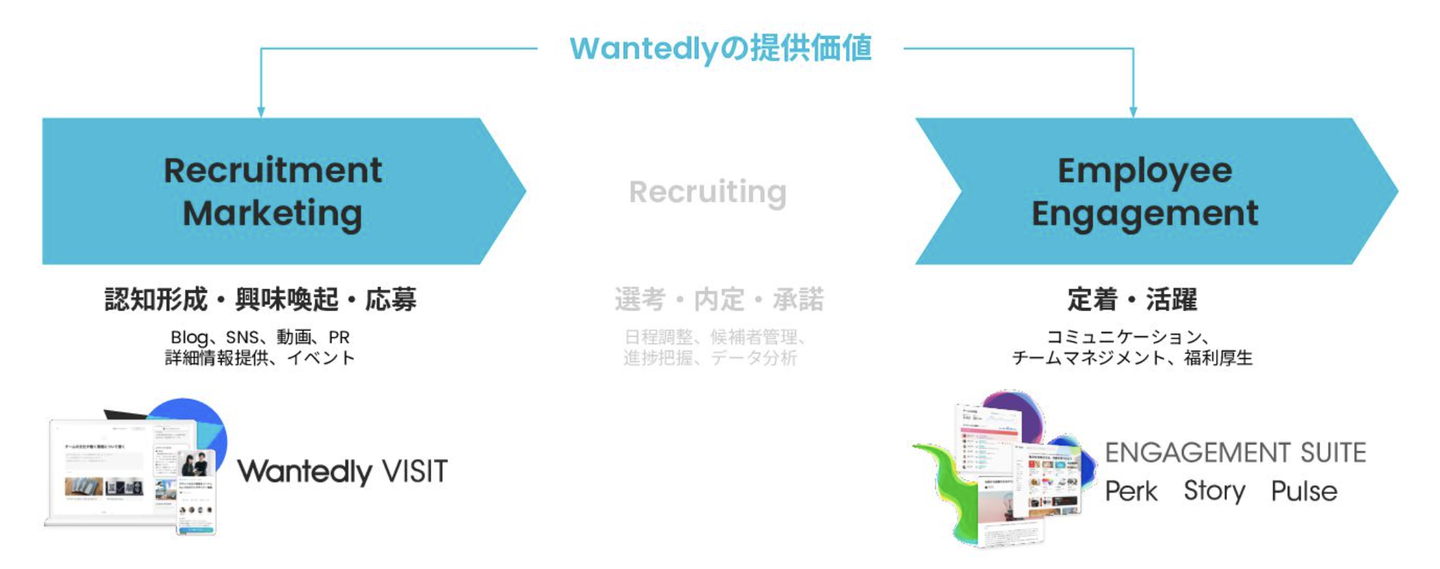 ウォンテッドリーでは「究極の適材適所により、シゴトでココロオドルひとをふやす」をミッションとして仕事に関するサービスを展開しています。ココロオドルシゴトを見つけてその環境で活躍するまでを “Recruitment Marketing”、 “Recruiting”、”Employee Engagement” というの 3つの領域に分割して考え、その中の “Recruitment Marketing” と ”Employee Engagement” でそれぞれ Wantedly Visit と Engagement Suite というサービスを展開しています。