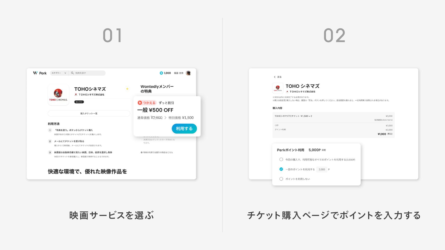 Perkポイントを、1ポイント = 1円として、TOHOシネマズやイオンシネマでの映画チケットの購入の際にご利用いただけます。