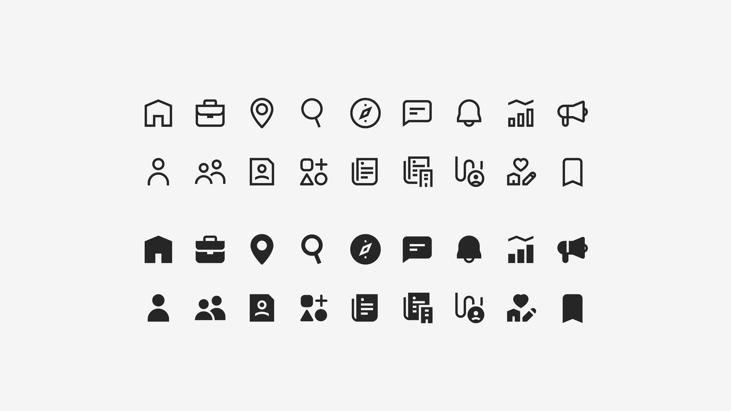 最終的に採用されたデザインは、Wantedlyらしさや、オリジナリティを表現するために、各アイコンのディテールに、VI/CIの造形から、線の太さや傾きの角度、角のRのサイズなどを抽出し反映させています。シンプルでモダンな形状のOUTLINE(線)のデザインをベースに、FILL(塗り)の仕様も用意しました。