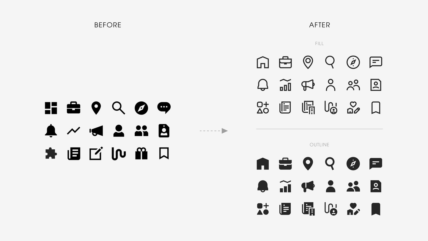 本来UI/UXデザインにおけるグラフィックアイコンは、テキストよりも短い時間で情報を伝達するための効果的なコミュニケーションであるべきなのですが、直感的に意味が伝わりづらい形状のものが散見されたり、OutlineとFillなど異なる表現が混在するなど、一貫性が欠如した状態でした。