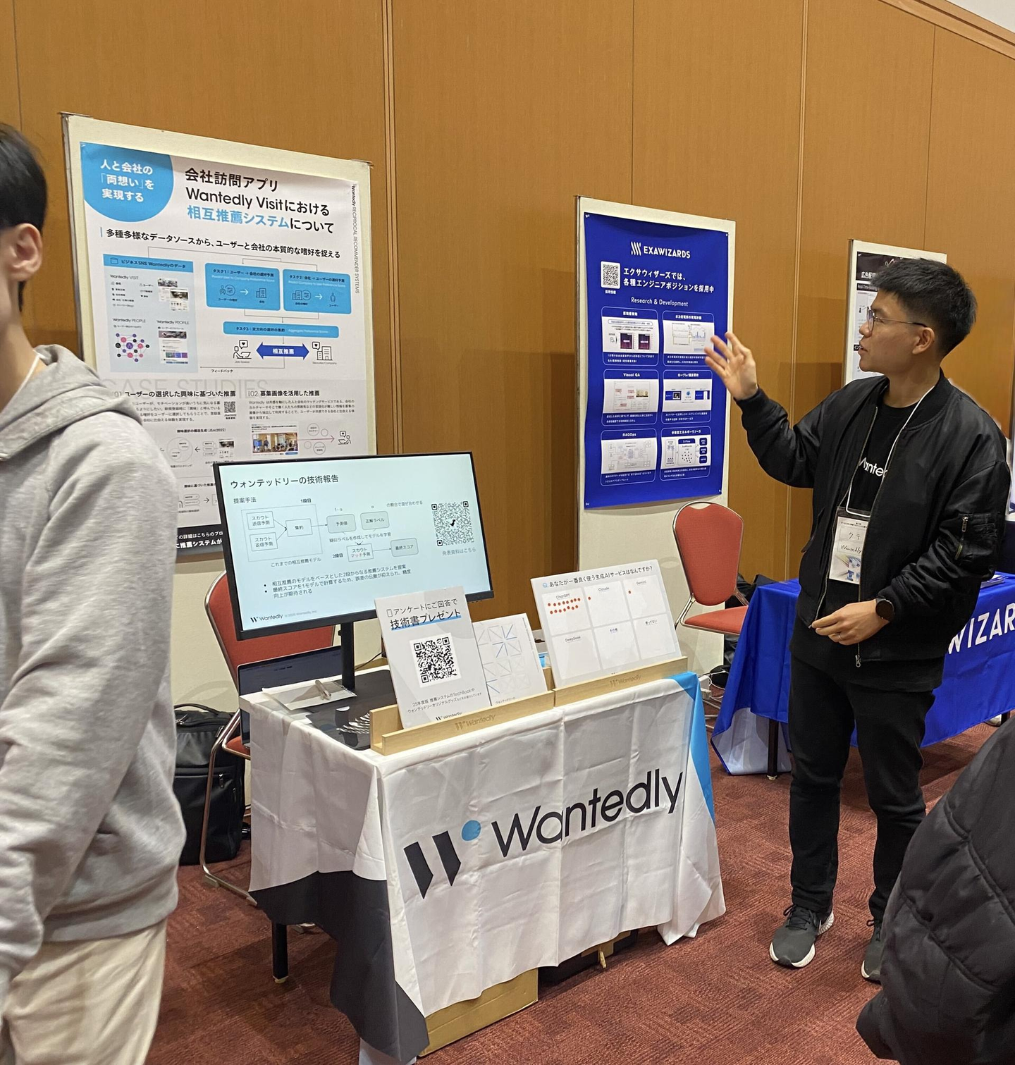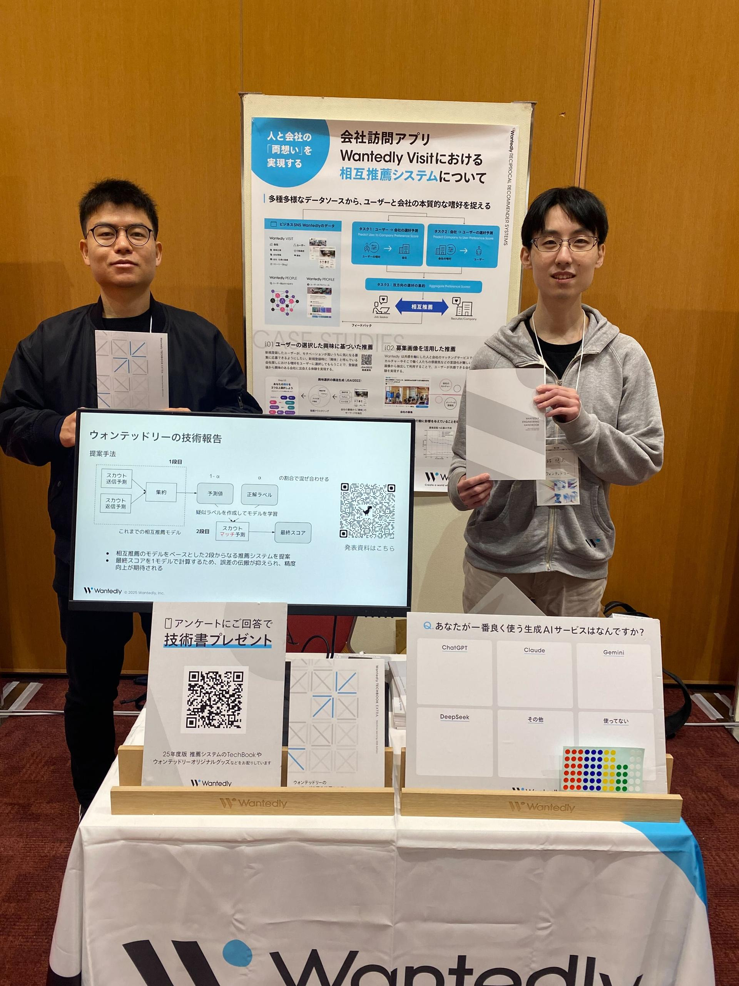 後半の3/3 - 3/4では、私を含め弊社のデータサイエンティスト3名(市村、林、右手)が現地参加し、スポンサーブースを出展しました。ブースでは、ウォンテッドリーにおける相互推薦システムについて説明を行い、アンケートに回答いただいた方には 弊社のエンジニアとデザイナーが作成した技術書をプレゼントしました。
