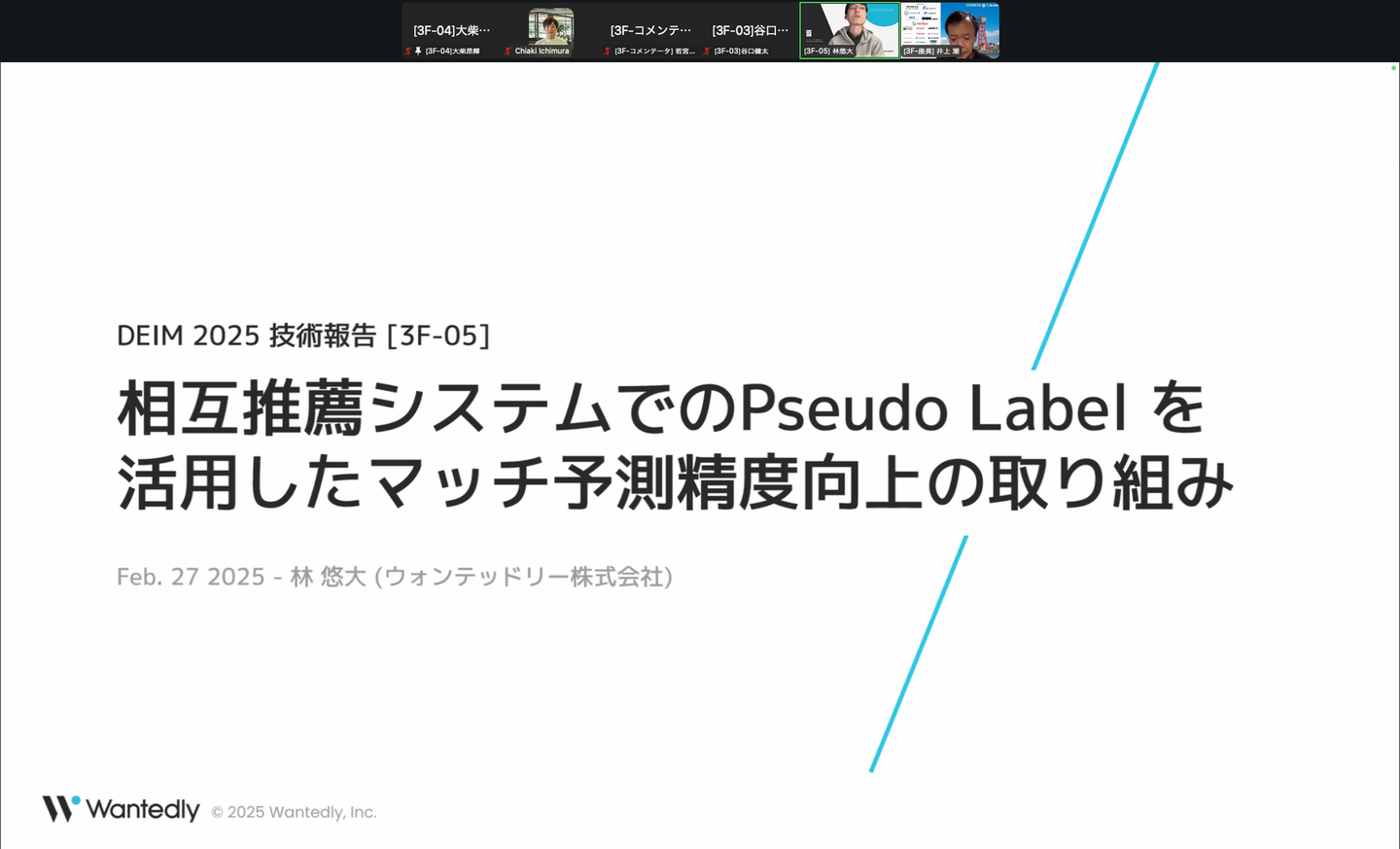 初日の2/27には、弊社の林が「相互推薦システムでのPseudo Label を活用したマッチ予測精度向上の取り組み」というタイトルで発表しました。