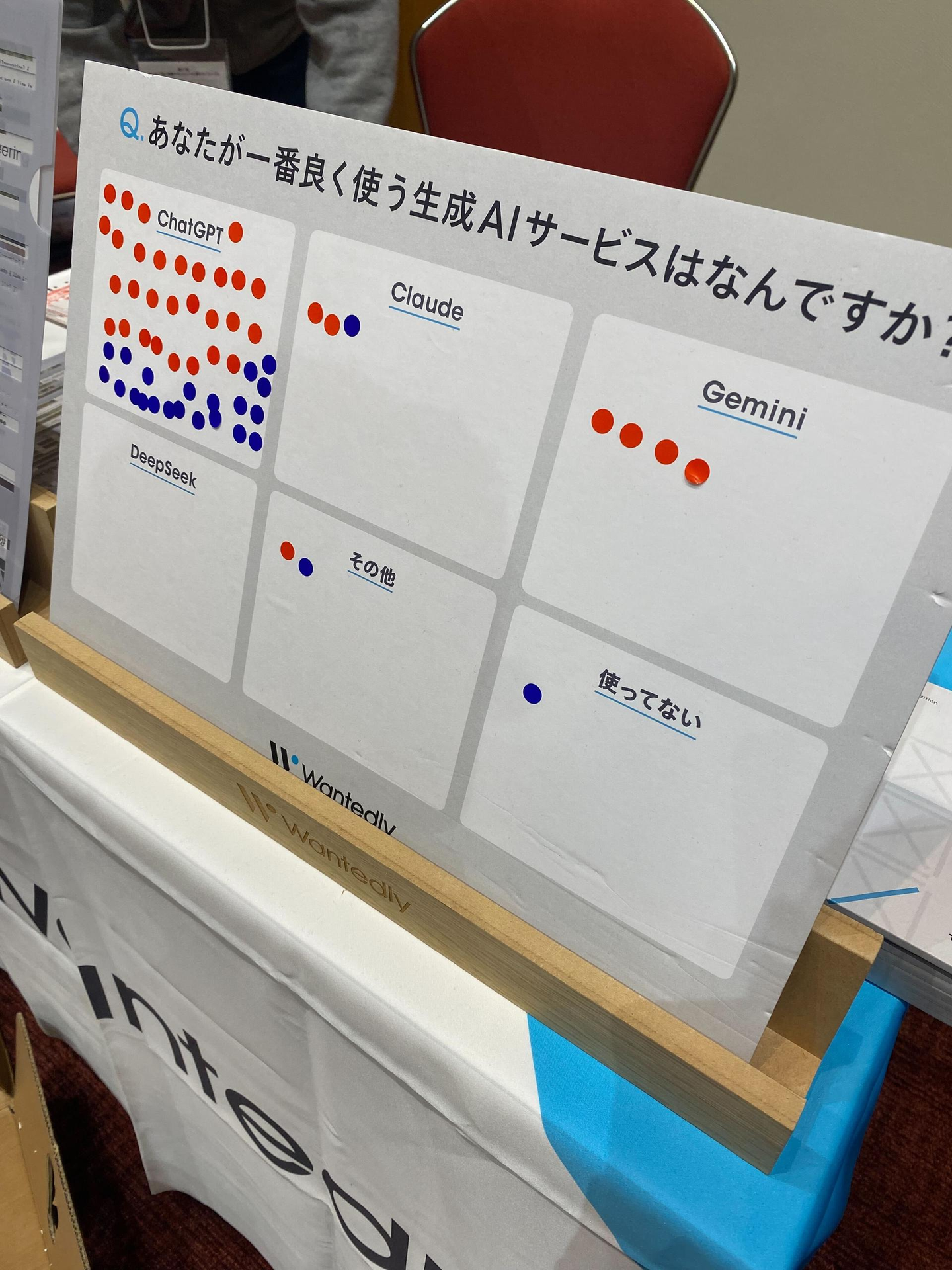 また、アンケートとは別に、「あなたが一番よく使う生成AIサービスは?」という質問を実施しました。一人一票での回答をお願いしていたため1位はダントツでChatGPTでしたが、ClaudeとGeminiなどの複数モデルを併用している方が多いという印象を受けました。