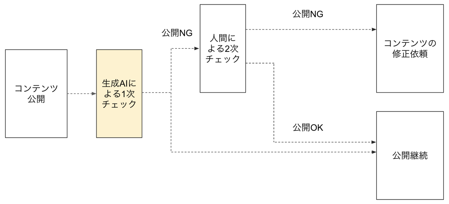 もともと1次チェックも人間が行っていましたが、コンテンツ量の増大に伴いモデレーション担当者の作業工数が増大していたため、現在では1次チェックを生成AIに部分的に置き換えています。