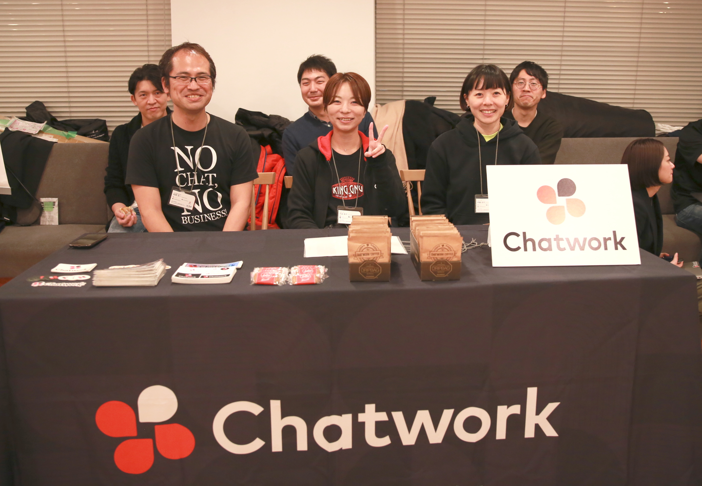 クラウド型ビジネスチャットツール「Chatwork(チャットワーク)」を主力事業として展開されています。「働くをもっと楽しく、創造的に」のミッションのもと、中小企業をはじめ大企業、教育機関、官公庁に採用され、各組織の生産性向上やコミュニケーション活性化に貢献。イベントでは、「Chatwork」のロゴ入りのコーヒーとステッカーをお配りされていました。