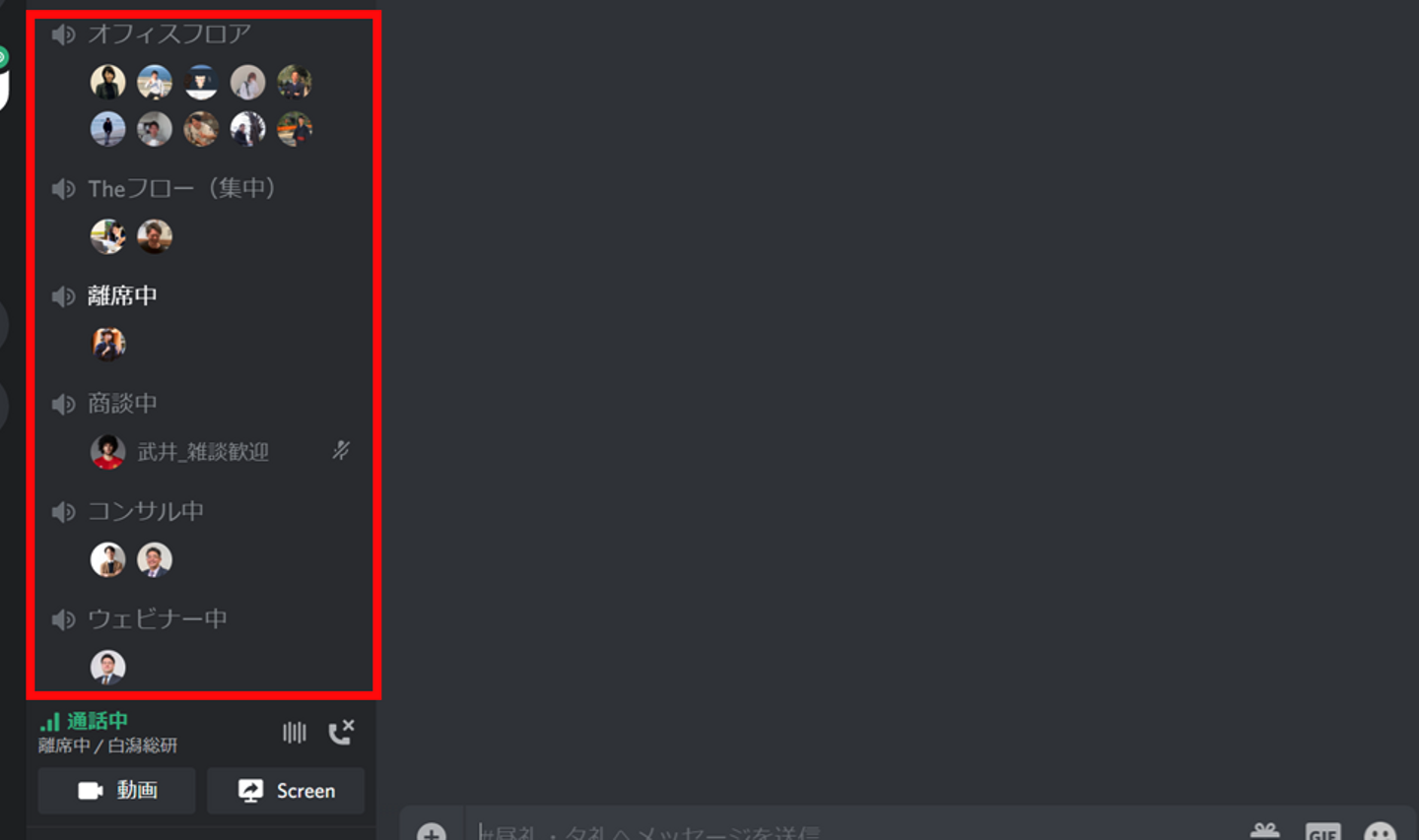 実際にDiscordを活用したバーチャルオフィスの様子がこちら。離席中の方や商談中の方々以外はオフィスフロアに集合するような設計に。
