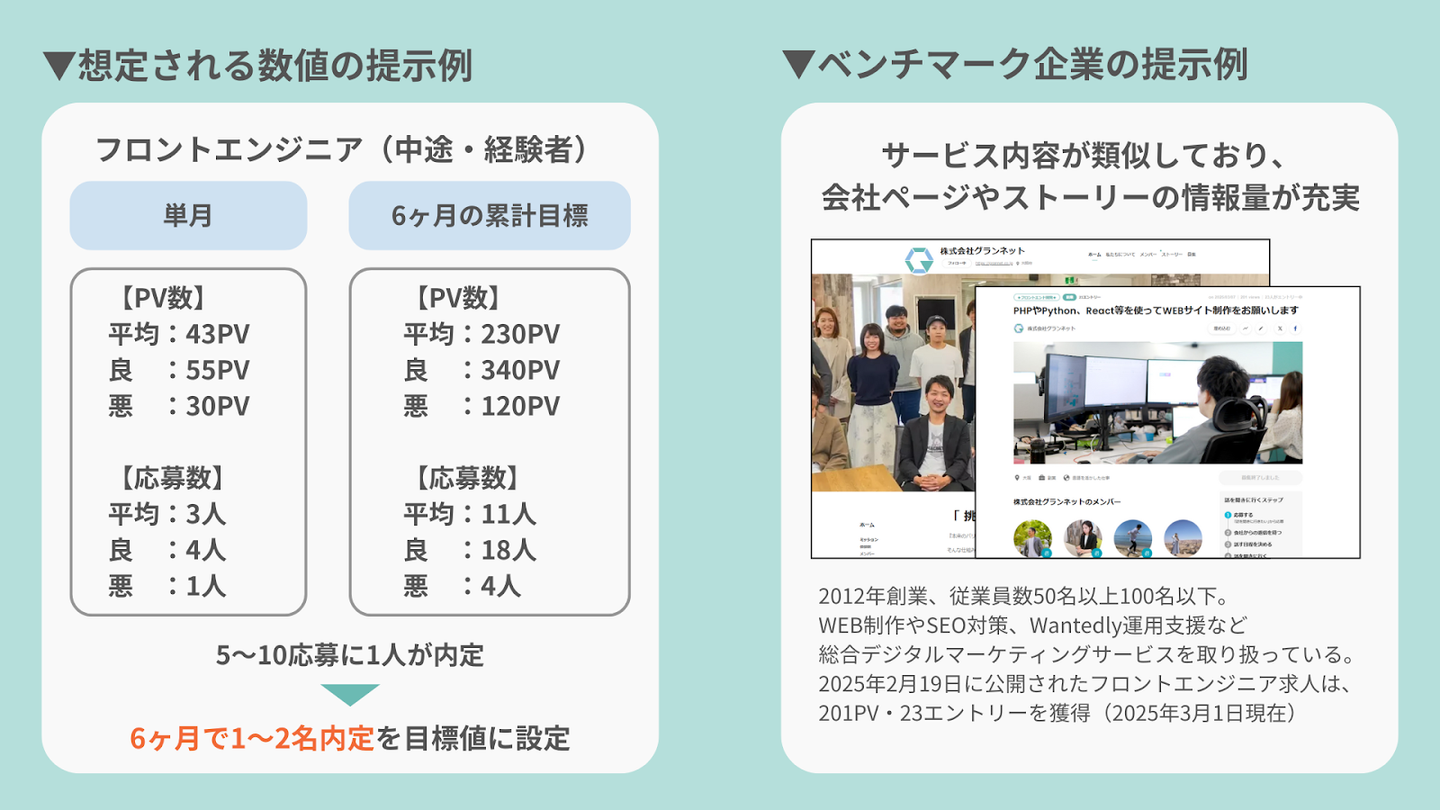 弊社はエントリーの目標値や内定数を、実績や競合他社のエントリー・PV数、クライアント様のポテンシャルなどから、具体的に想定した上で提案を行っています。