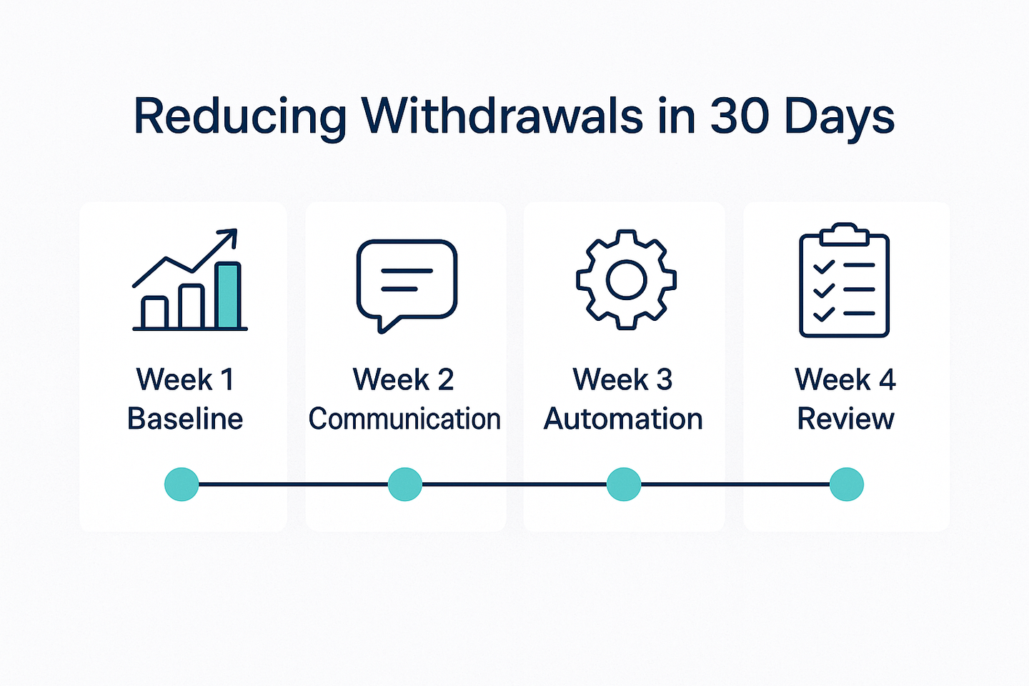 Treat the 30 days as a structured experiment. Set a clear goal, such as reducing withdrawals at one specific stage by a defined percentage. Decide which change you will make to support that goal, and apply it consistently to all relevant roles during the period.
