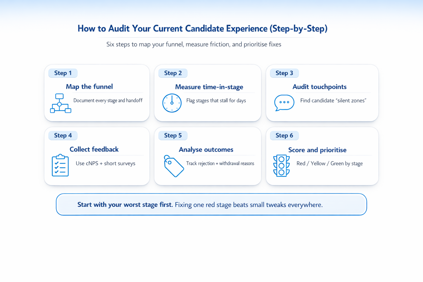 Step 6: Score each stage and prioritise fixes. Assign each funnel stage a simple red/yellow/green rating based on time-in-stage, satisfaction score, and drop-off rate. Focus your optimisation effort on the red stages first. (A red stage is one where friction is clearly hurting the process, for example through long delays, poor communication, or unusually high candidate withdrawal.) A single improvement to your worst-performing red stage will produce more measurable impact than incremental tweaks to stages that already work reasonably well.