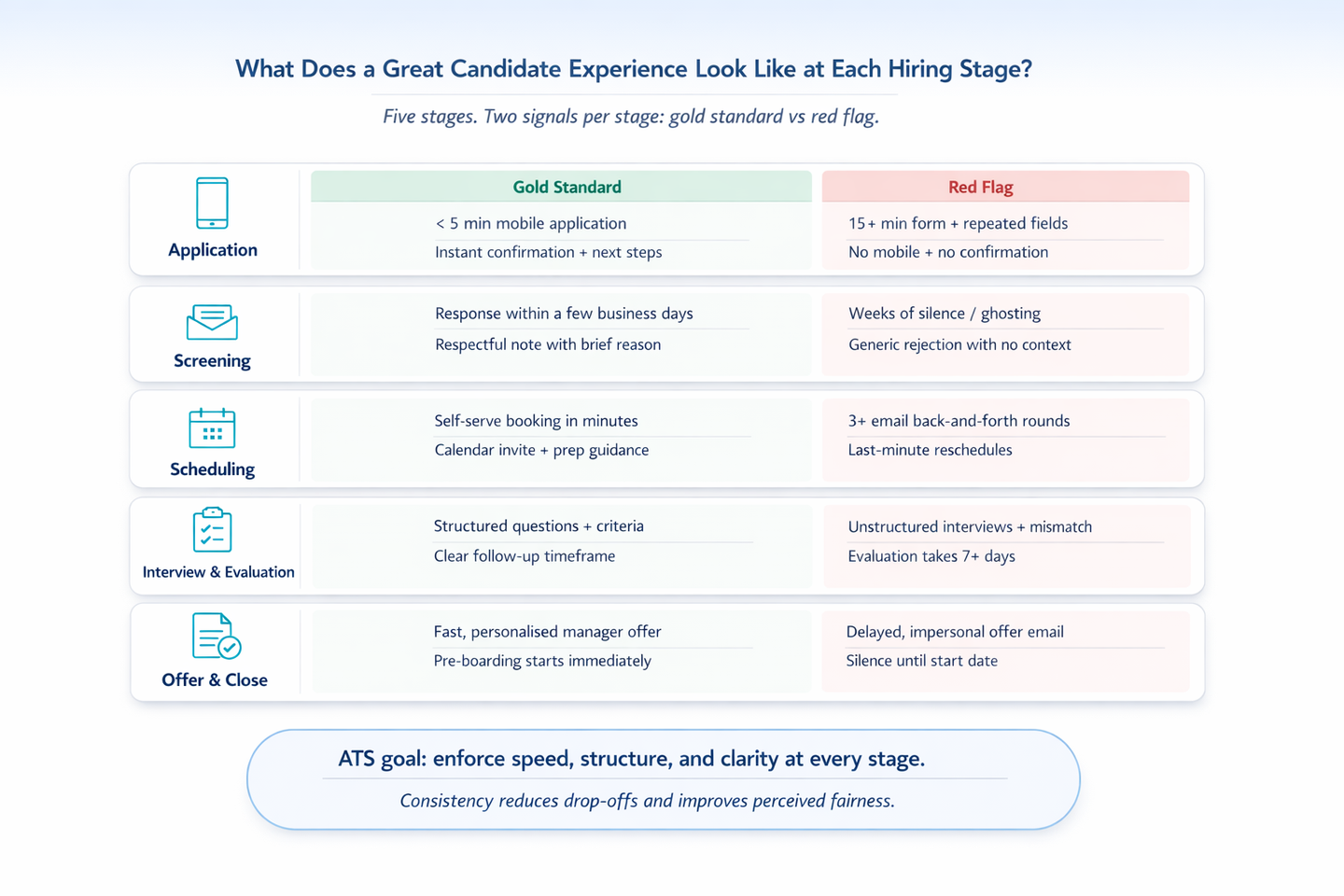 A great candidate experience is consistent and measurable across five stages: application, screening, interview scheduling, evaluation and interview, and offer and close. Each stage has distinct candidate expectations, and your ATS should enforce standards at every one.