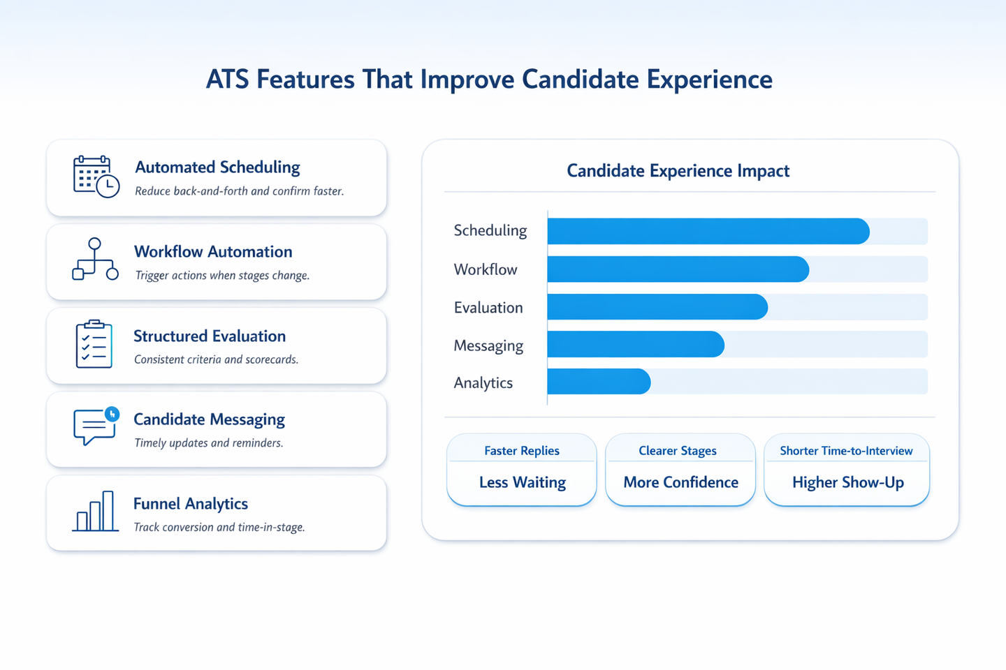 How does an ATS improve candidate experience? An ATS improves candidate experience by automating repetitive tasks like interview scheduling and status updates, standardising evaluations with structured scorecards, and providing analytics to identify where candidates drop off. This lets your team fix specific bottlenecks rather than relying on guesswork.
