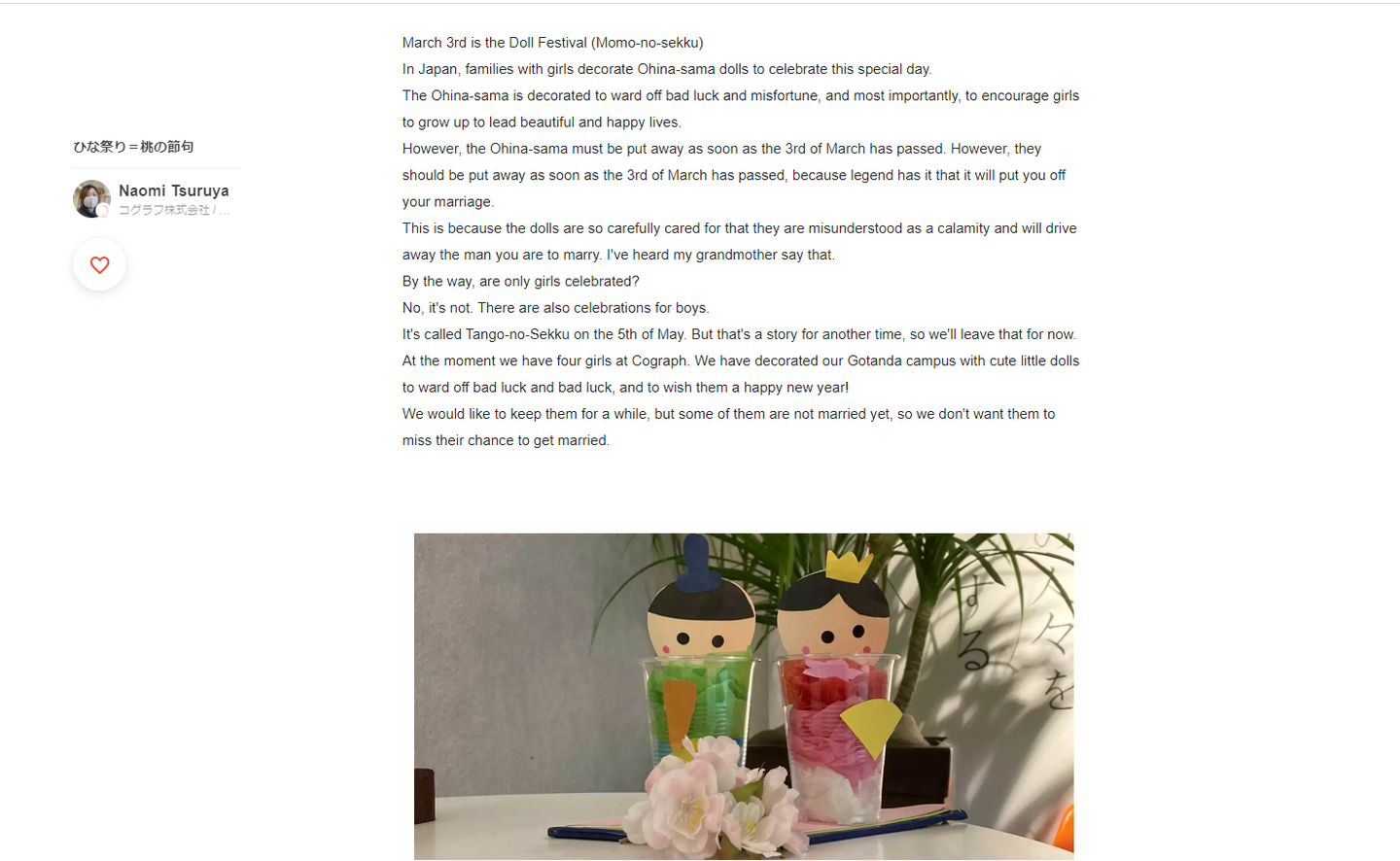 鶴谷:記事のテーマ選びは大事ですね。真面目な業務連絡はリアクションが少なくなってしまうため、3回に1回は目を引くおもしろい小ネタを挟むようにしています。日々業務を振り返って「これはメンバーの耳に入れておいてほしいな」と感じたトピックや、「エントランスに奇麗な花が飾られていた」といった自分のテンションが上がったささいな出来事とか。外国籍のメンバーと会話していると、おもしろいことが見つかるんですよね。そのような「文化の違い」の話題もあります。どうしても見つからないときは、カレンダーを眺めながら「日本では、今日は○○の日」ですという話題を記事化しています。
