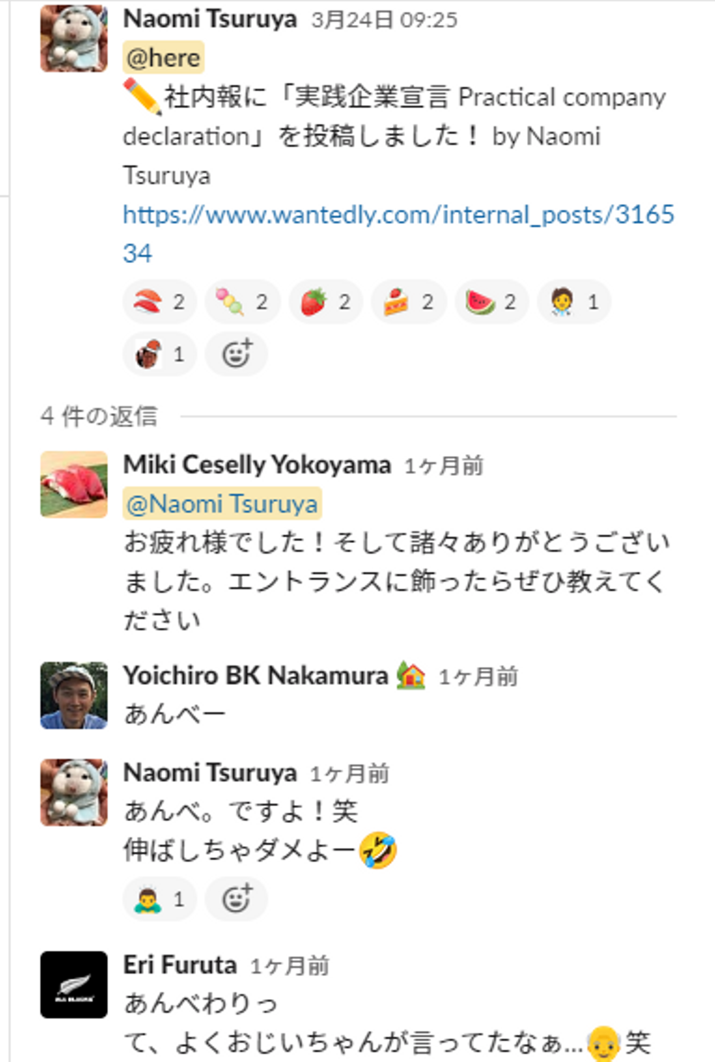読んでくれたメンバーからは、Slackでレスポンスが寄せられたり、「見たよ」「おもしろかったよ」とか、「こういう日本の文化が知りたかったから読めてよかった」と直接伝えたもらえたりするようになり、うれしいですね。