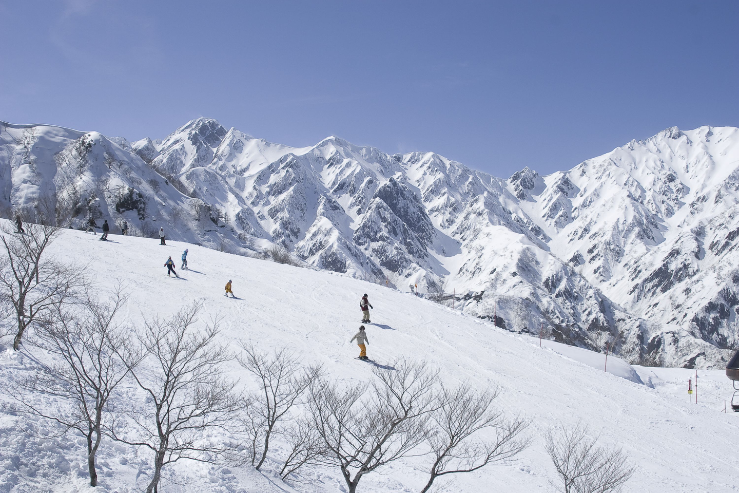 秋には北アルプスの山々で、見事な紅葉を見ることができます。スキー場のロープウェーで山頂に登り、赤や黄色、橙色、燃えるように紅葉した山々は圧巻です。
