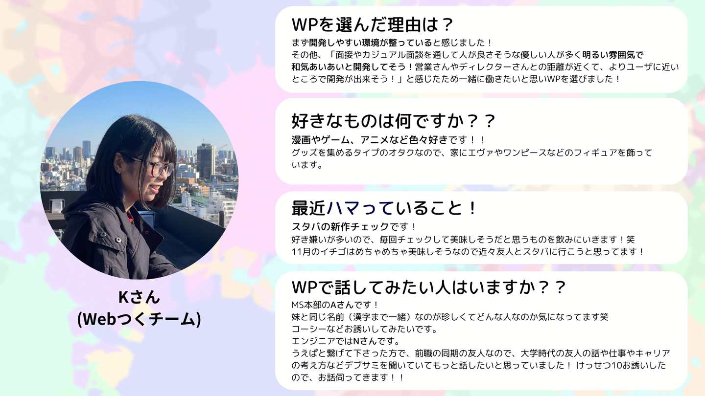 まず開発しやすい環境が整っていると感じました! その他、「面接やカジュアル面談を通して人が良さそうな優しい人が多く明るい雰囲気で和気あいあいと開発していそう!営業やディレクターのメンバーとの距離が近くて、よりユーザーに近いところで開発が出来そう!」と感じたため一緒に働きたいと思いウエディングパークを選びました!