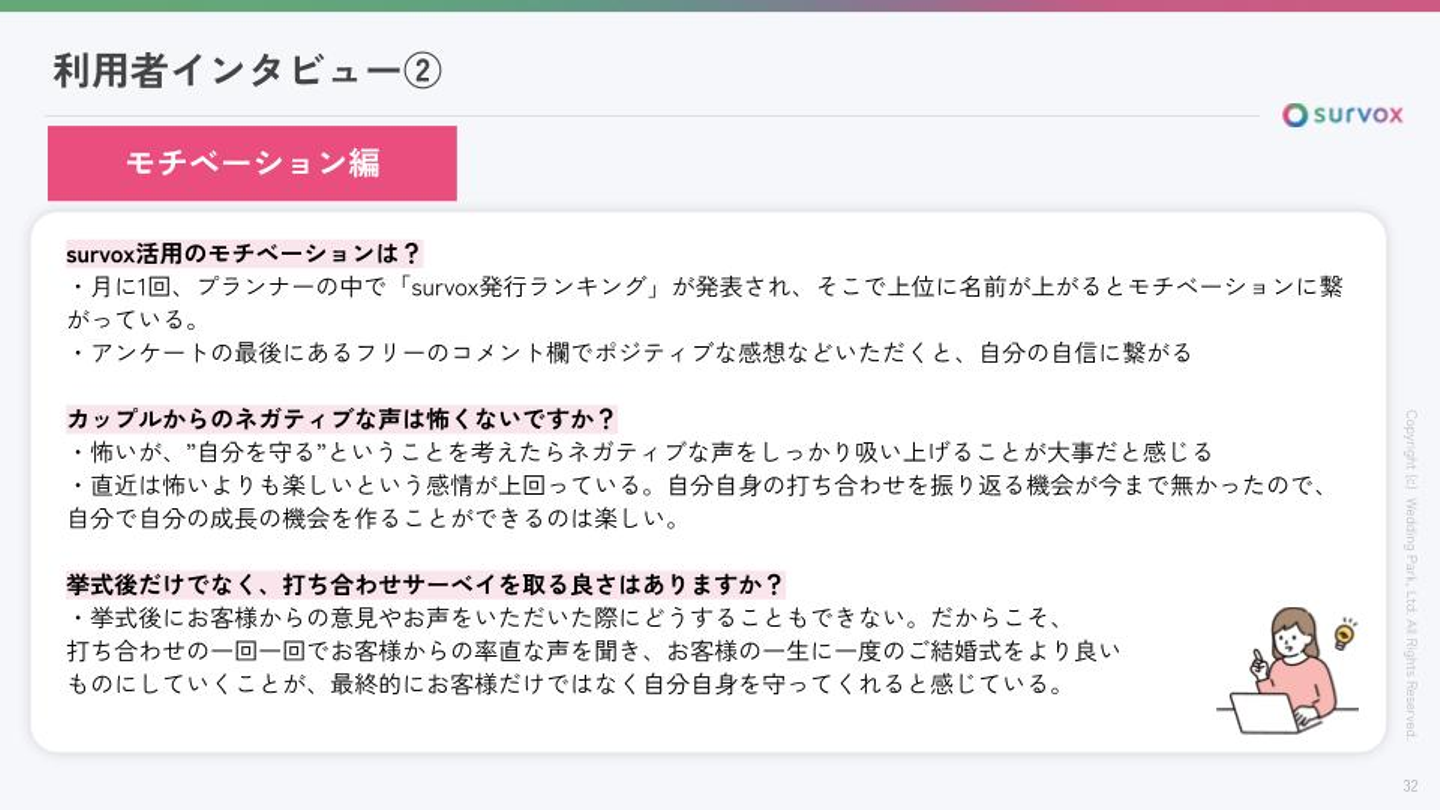 Yさん: survoxだと、紙のアンケートを回収して集計して…という作業を自動化することで分析する時間を取れるようになり、デジタルの力に期待感を感じてもらえています。 また、カップルからのフィードバックが随時受けられることで、“モチベーションにつながった”、“自身の成長を実感できた”といった声をいただきますし、評価や表彰で活用いただく事例も出てきています。