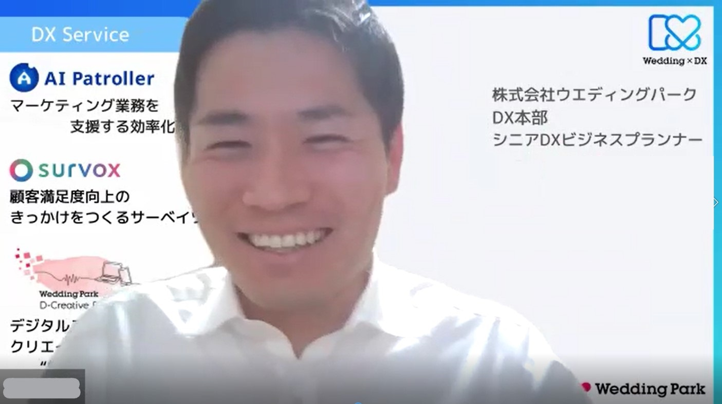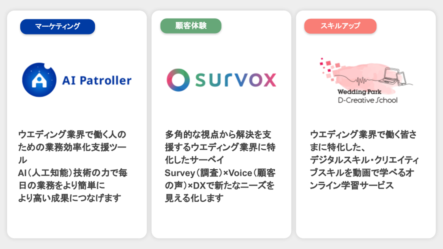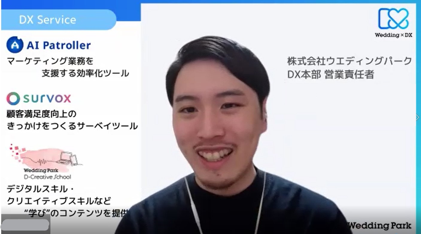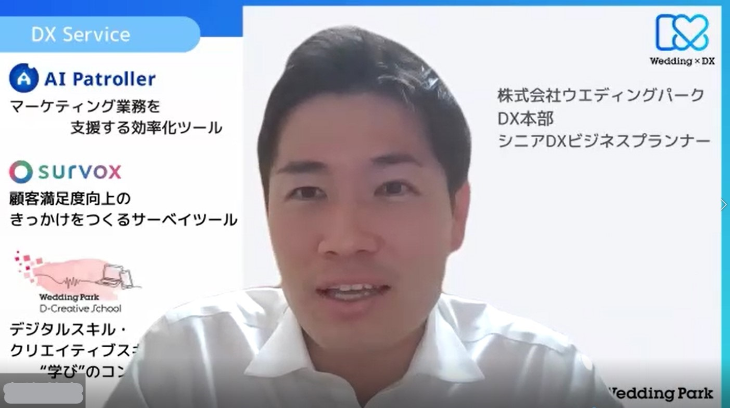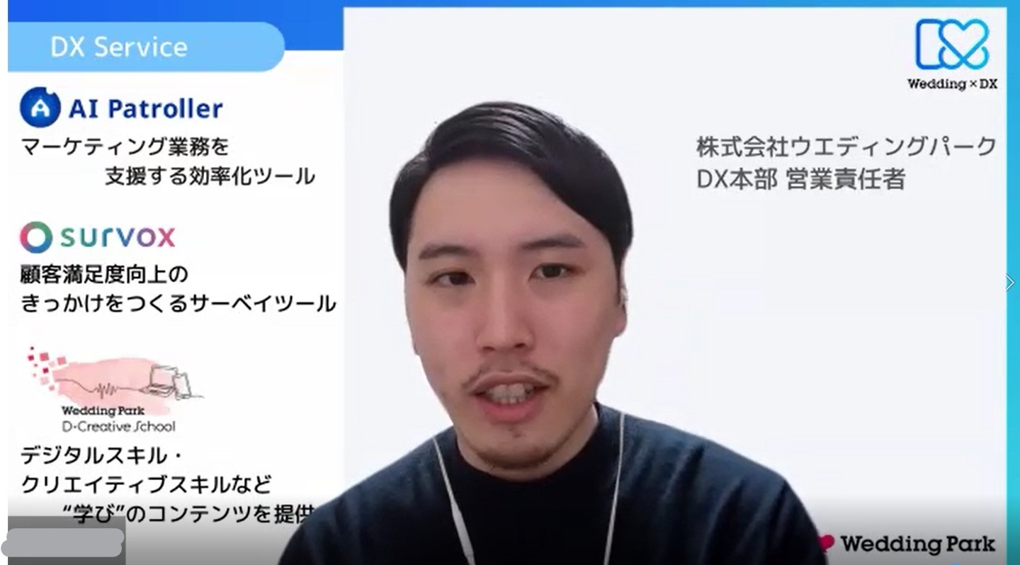 「AI Patroller」 …AI(人工知能)技術を活用した業務効率化支援ツール。日々のクリエイティブ自動保存や画像・テキストの比較、掲載画像のパトロールなど、毎日の業務をより簡単により高い成果につなげることを目指しています。 「 survox(サーヴォックス) 」 …多角的な視点から解決を支援するサーベイツール。カップル向けの満足度サーベイでニーズを見える化して、CX向上につなげることを目指しています。 「 D-Creative School 」 …デジタルスキル・クリエイティブスキルを動画で学べる、ウエディング業界向けオンライン学習サービス。リスキリングによってウエディング業界でより長く、より活躍するためのスキルアップを支援しています。 Mさん: 結婚や結婚式の本質的な魅力を感じている一方で、ウエディング業界はこのままではいけない、自分たちがやらないと変わらないという危機感や使命感があります。 特に「人材」や「デジタル」に関する課題は、業界全体で抱えながらも、どうしていいかわからないという方が多く、変わってこなかった領域でもあります。