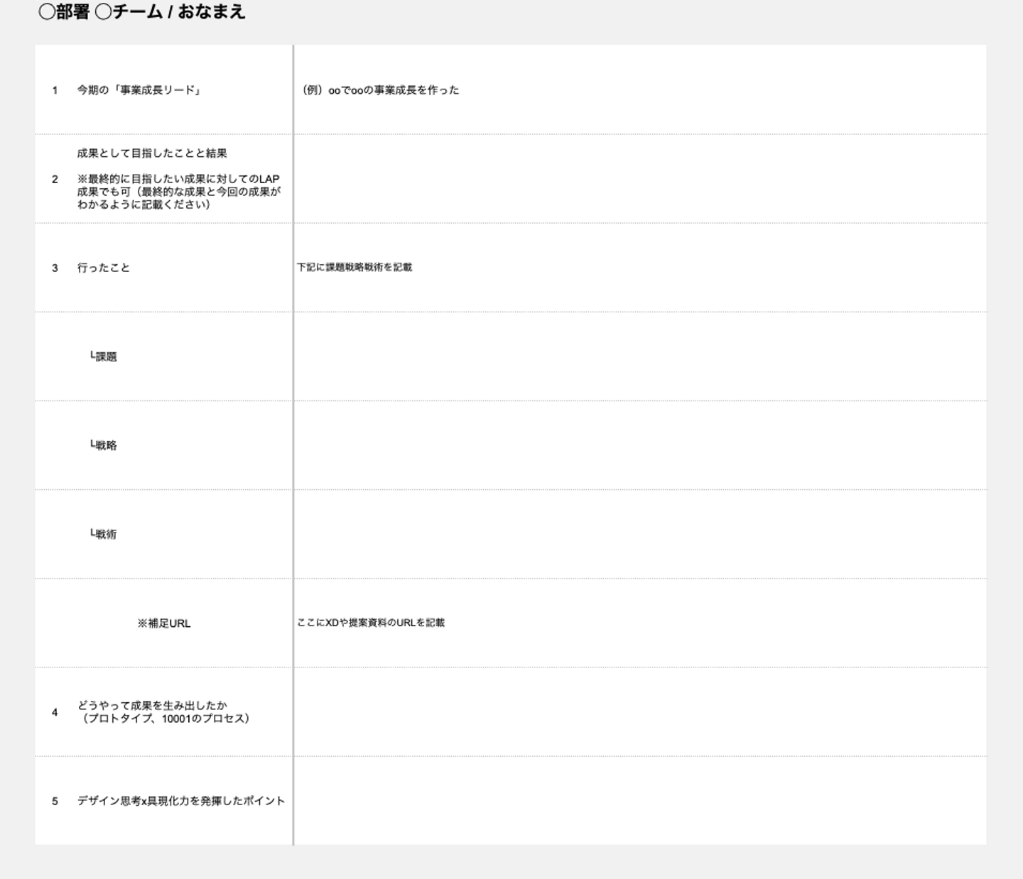 事例は以下のフォーマットに沿って提出。どんな事業成長リードを行ったのか、そして、そのプロセスについてアピールできるフォーマットです。