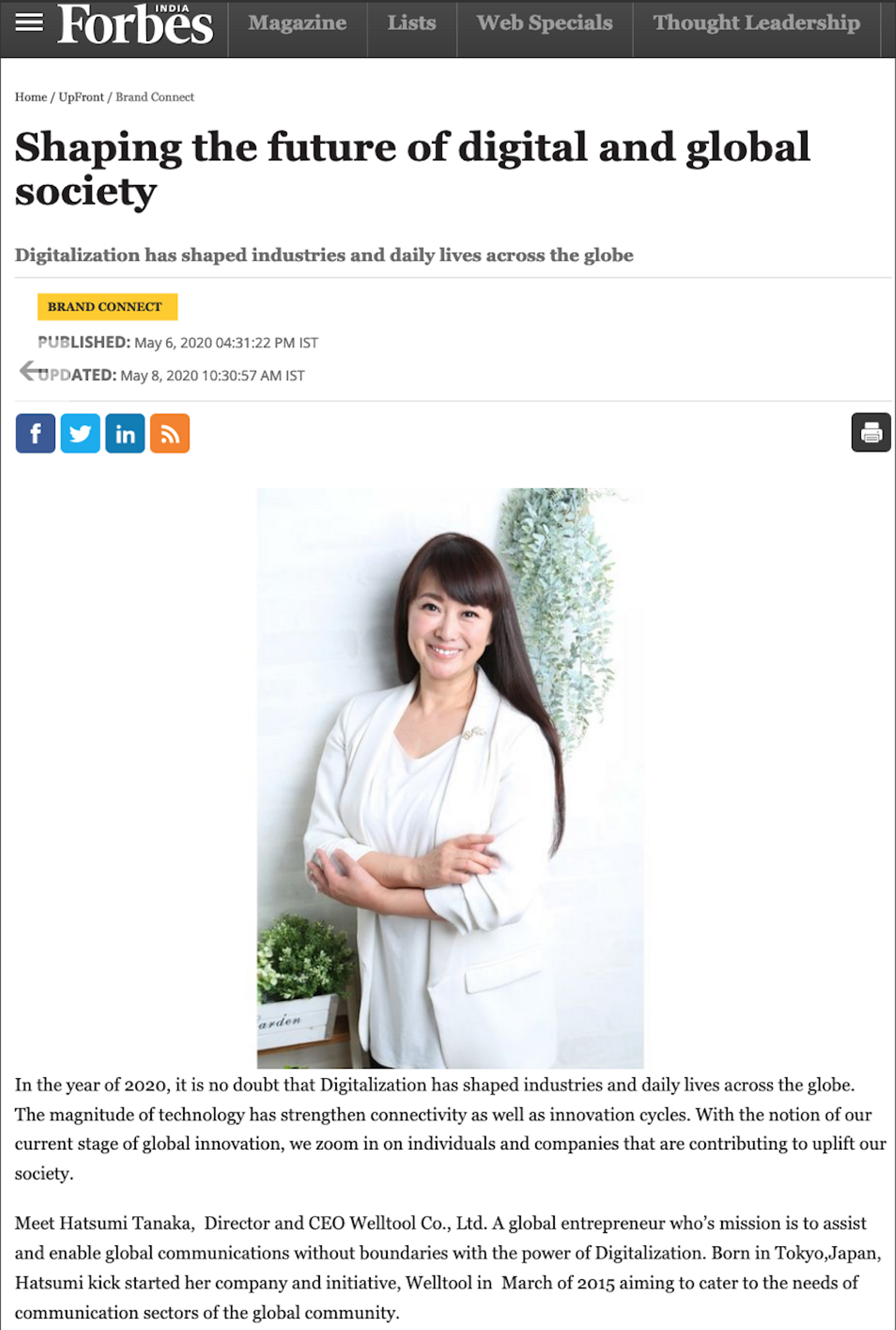 Welltool株式会社、並びに弊社代表の田中初実が Forbes India(フォーブスのインド版)に掲載されました。