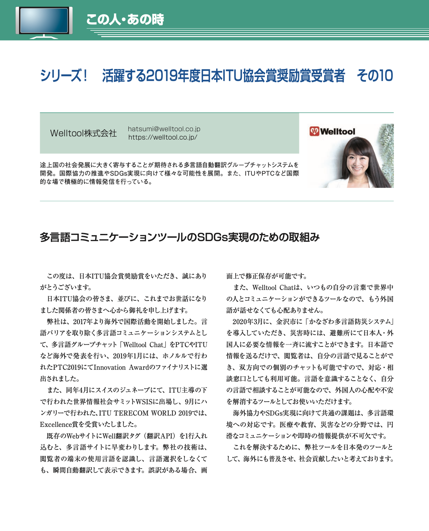 日本ITU協会が毎月HPで配信しているITUジャーナルの2020年7月号に、多言語コミュニケーションツールを用いたSDGs実現への取組みについての記事が掲載されました。