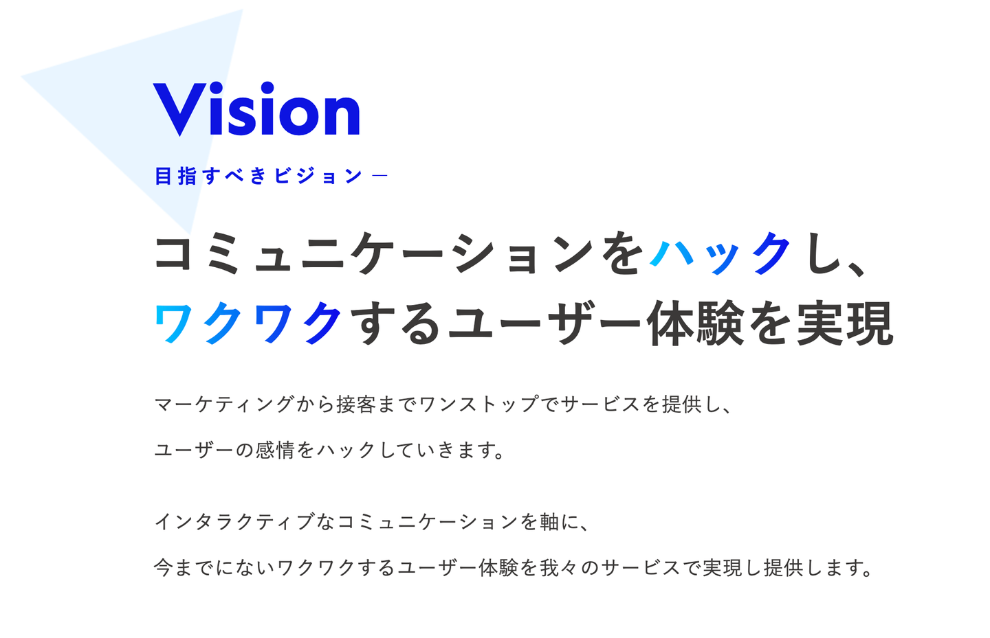 ここの根底のところは今後も大事にしていきたいなと思って、今回「コミュニケーションをハックし、ワクワクするユーザー体験を実現する」という言葉に落とし込んだ。
