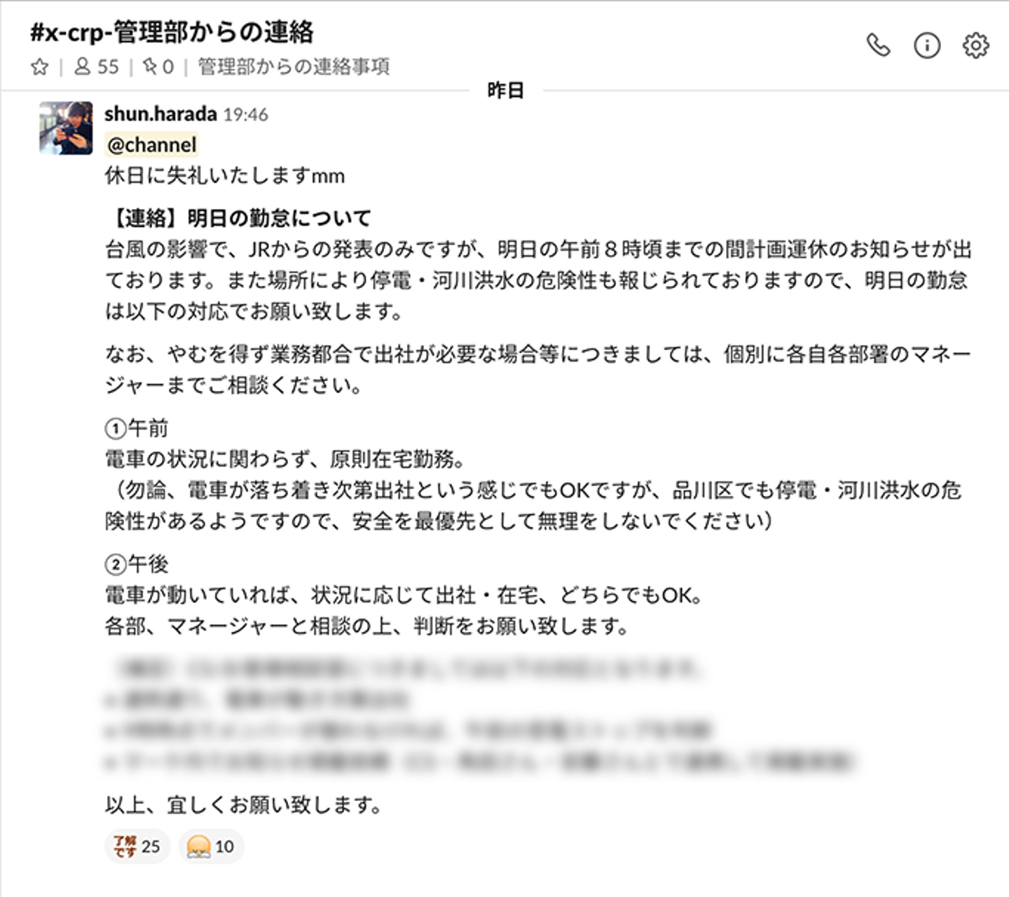 ▲台風直撃前夜に送られてきた、在宅勤務を推奨するSlackメッセージ