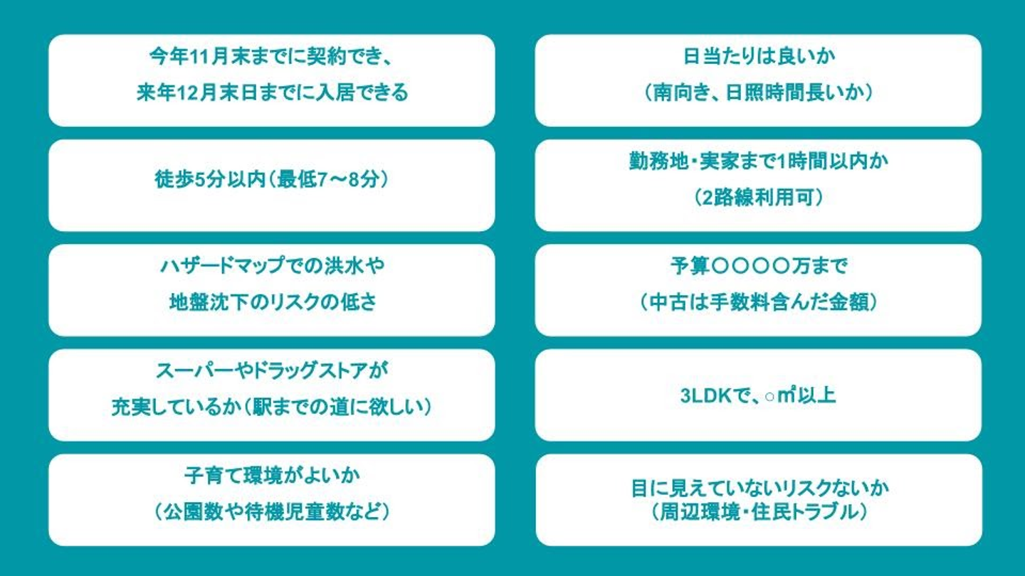 例)不便な生活は嫌だ→コンビニやスーパー、ドラッグストアが徒歩圏内にある