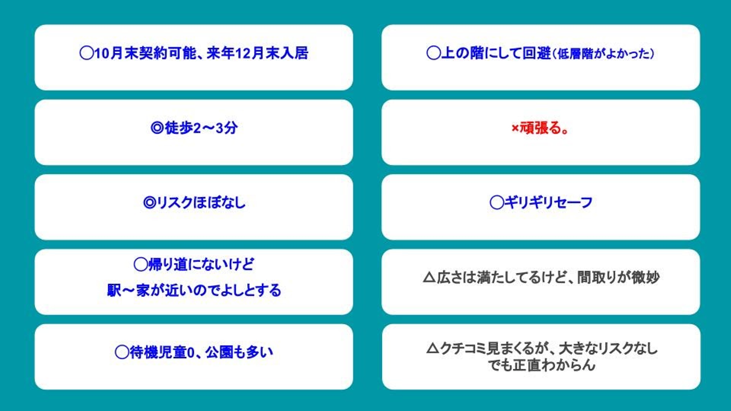 住まい探しの優先順位に限らず、多くの選択肢があって、人によって答えが異なるものに関しては、いろんな人に意見聞いたり、相談すると、客観的な意見をもらえて、視野が広がります。