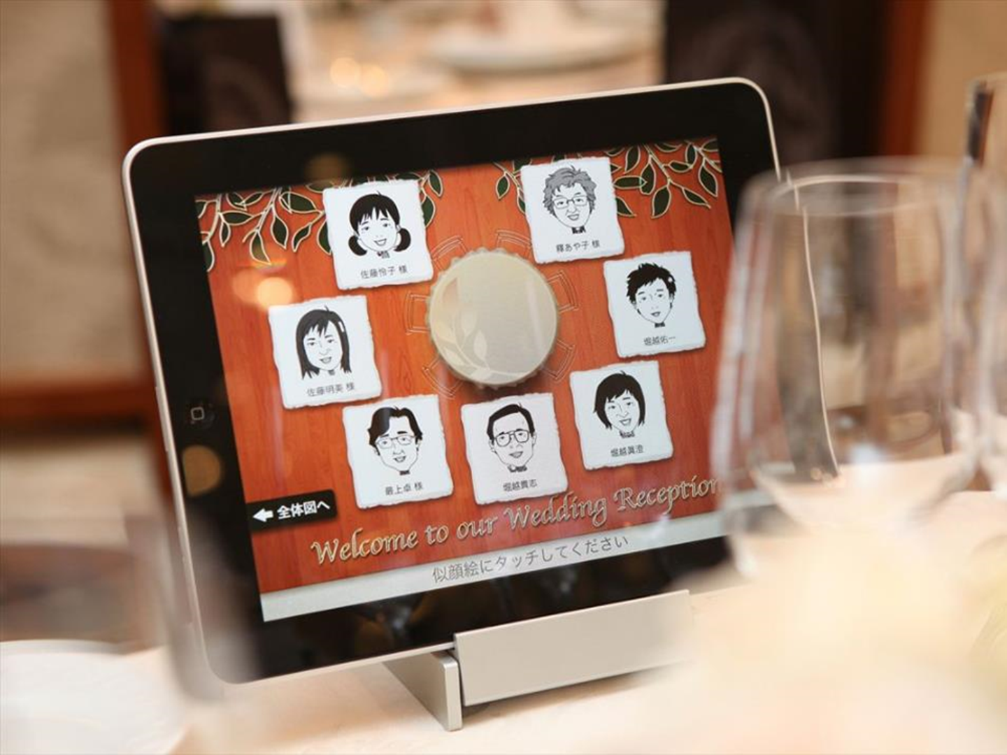 で、参加させていただいたら、自分の絵がタブレットに表示されている席次表をクリックすると似顔絵が出て、新郎新婦からのコメントが読めるみたいになってて。
