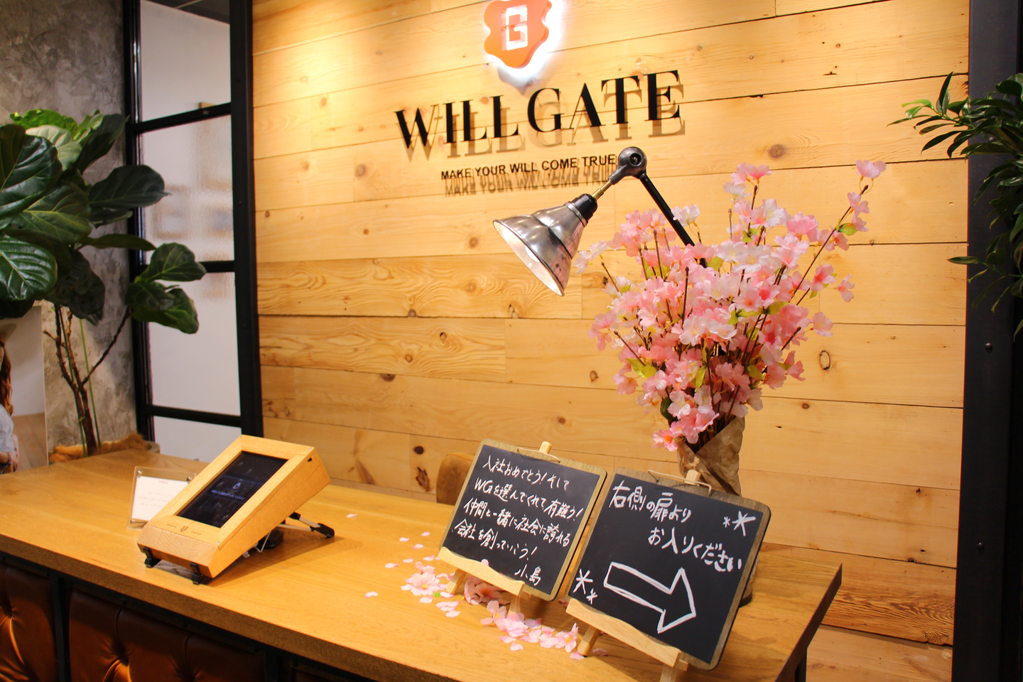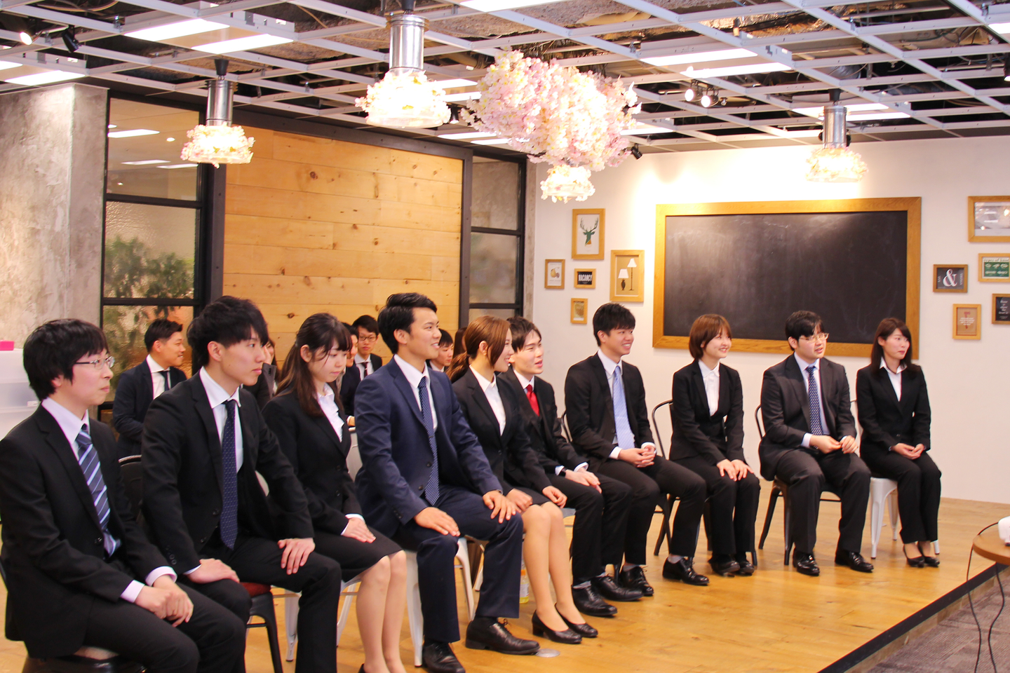 今年の入社式は、初の試みとして社内のリフレッシュスペースRoom0で行うことに。エントランス、会場ともにささやかではありますが、桜の装飾を施して華やかな雰囲気になりました。