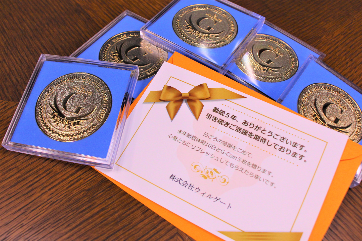 勤続10年以上の社員を対象とする企業も多いと思いますが、弊社では勤続3年、5年、10年(以降5年ごと)の社員が永年勤続表彰の対象です。副賞として勤続3年は5日間の永年勤続休暇、5年以上は10日間の永年勤続休暇と「G-Coin」(※)が付与されます。