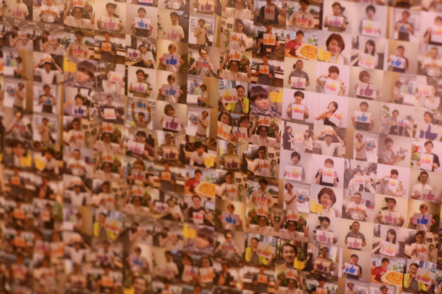 目を凝らして良く見ると、モザイクアートは動画にも使用した“いいね!”を社員が掲げている小さな写真で構成されています。