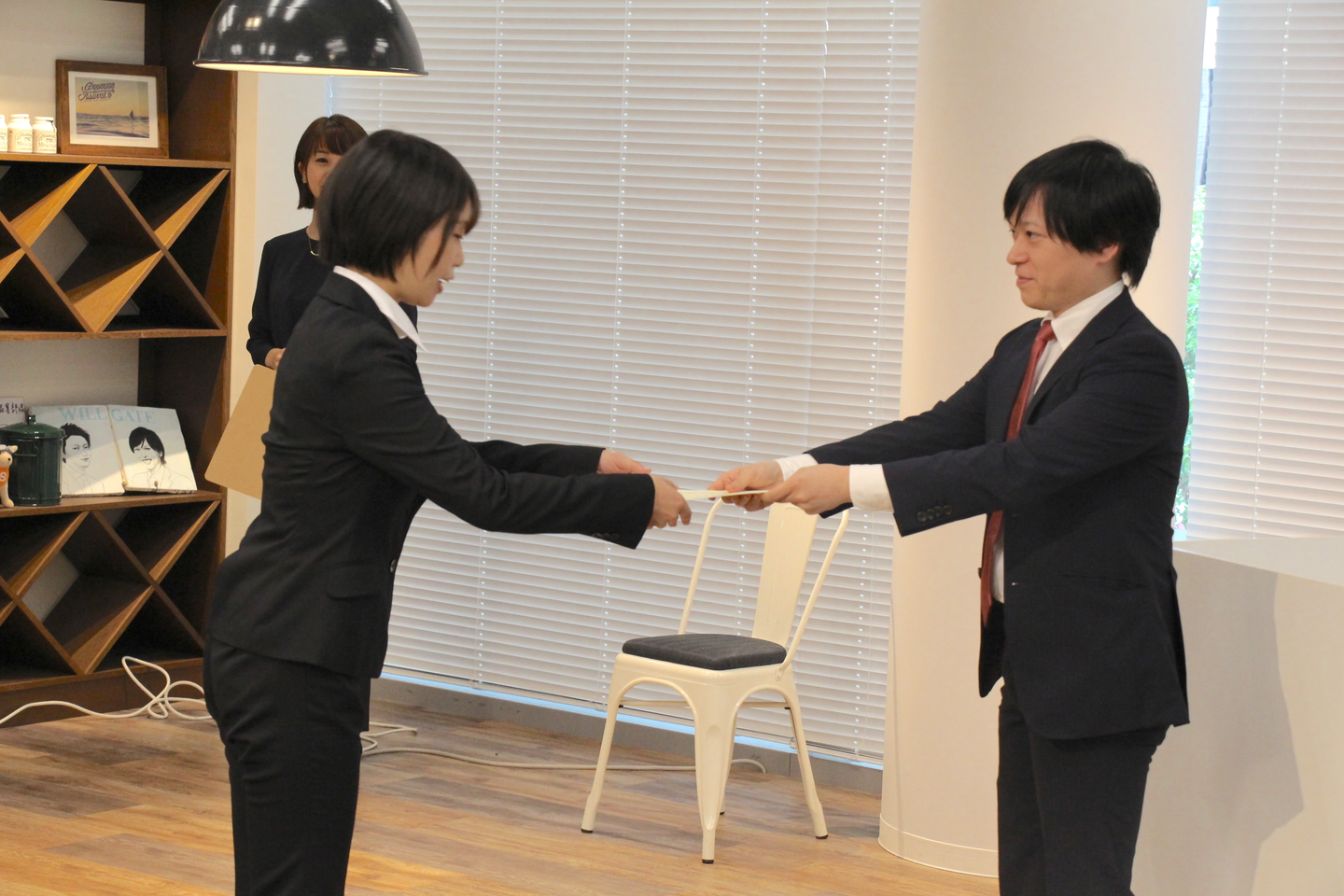 続いて内定証書の授与。内定者は、誇らしげな表情で小島から内定証書を受け取っていました。