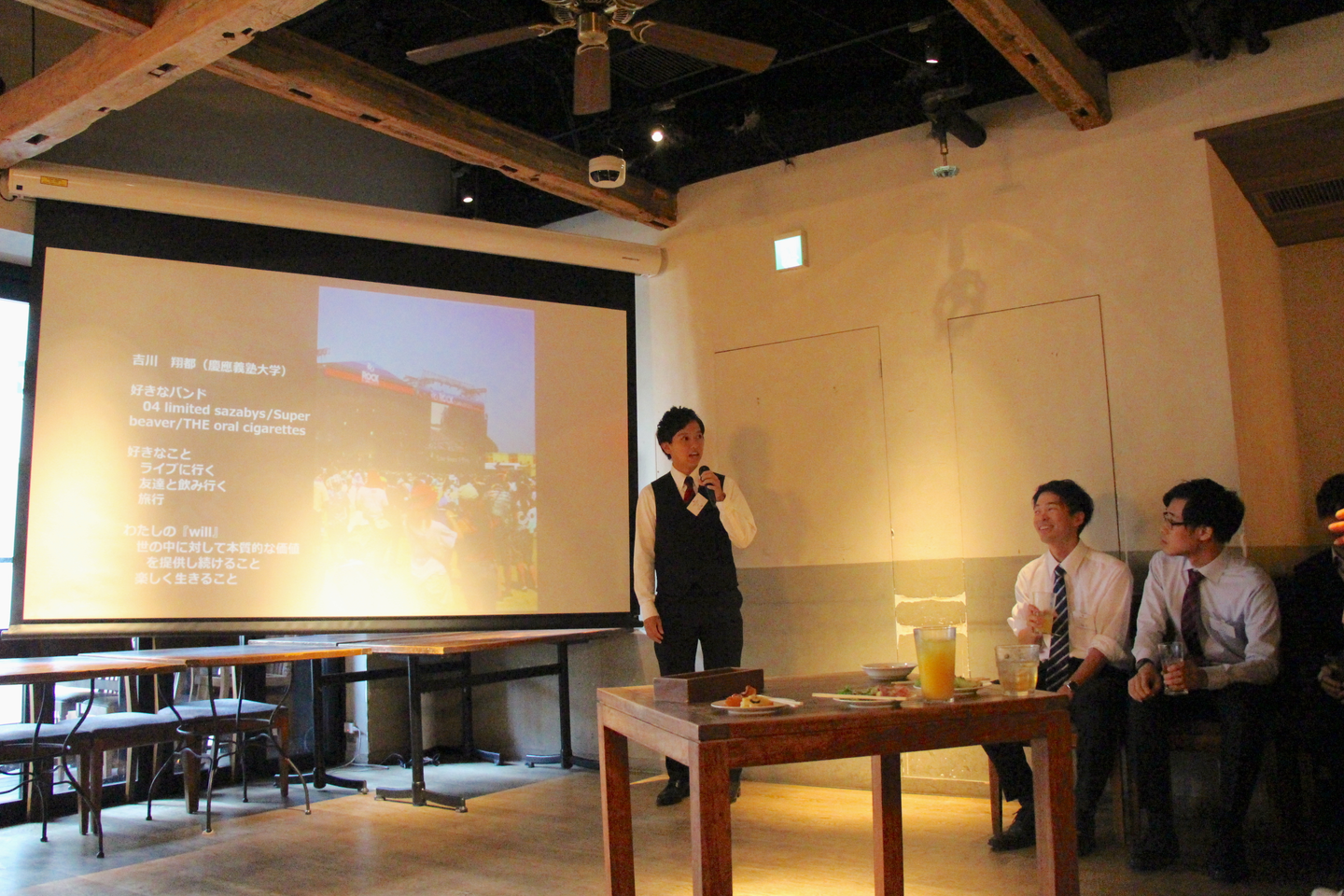 ウェルカムパーティは、内定者の自己紹介プレゼンからスタート。一人ひとりの個性が際立ったユニークなプレゼンに笑いが起きるなど、和やかな雰囲気の中行われました。大勢の社員の前での発表に緊張もあったと思いますが、みんな堂々とプレゼンをしていました。