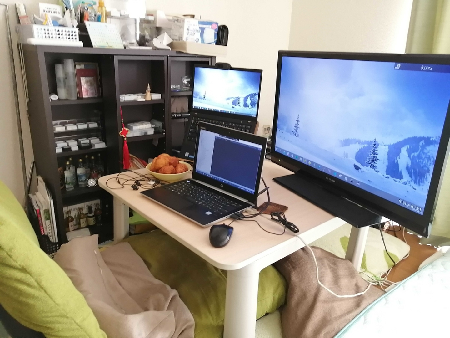 自宅ではそこまで環境が整っていないので、テレビと自PCをサブディスプレイにしてます。