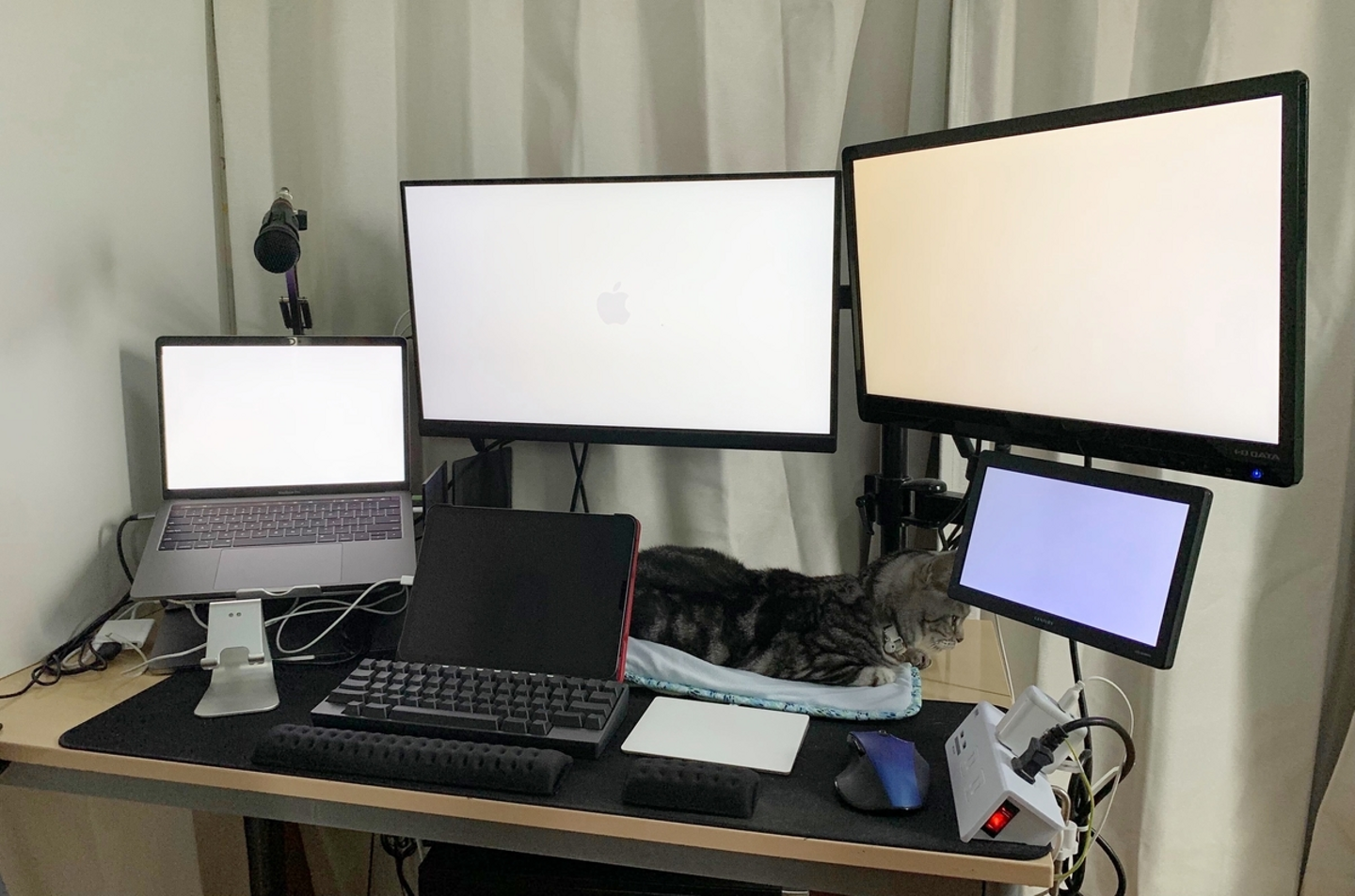テレワークが始まってから、家猫が机の上に居座るようになったので中央のディスプレイの下に猫の居場所を作りました。
