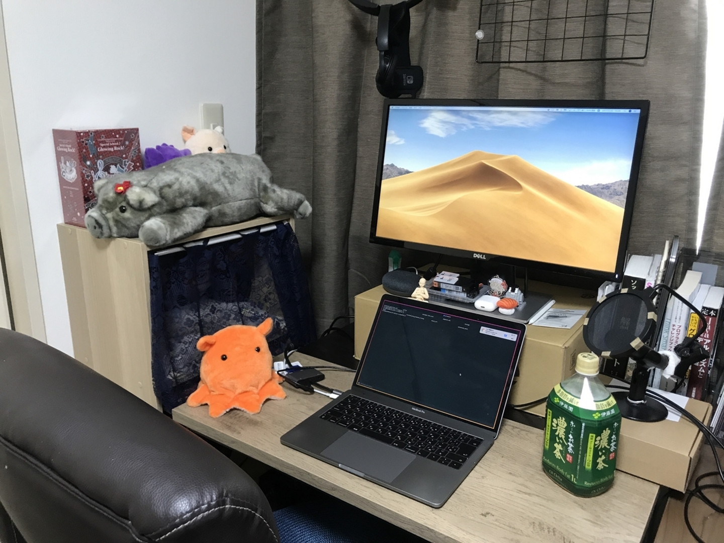 最後に自身の環境です。 テレワークに伴い、ディスプレイ等を購入したのですが、PCラックだけダンボールで済ましています。 オンラインMTGで「聞き取りやすさ」は非常に重要だと思うのでマイクもポップガードをつけています。