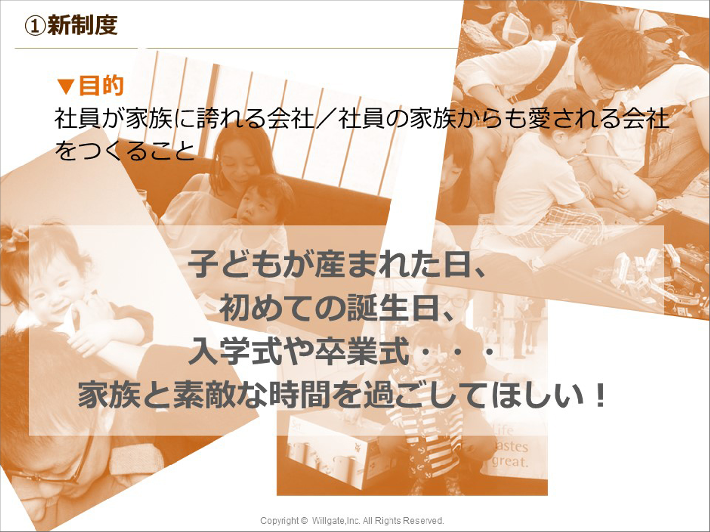 この制度を通じて、より社員が家族に誇れる会社、社員の家族からも愛される会社をつくっていきたいと考えております。