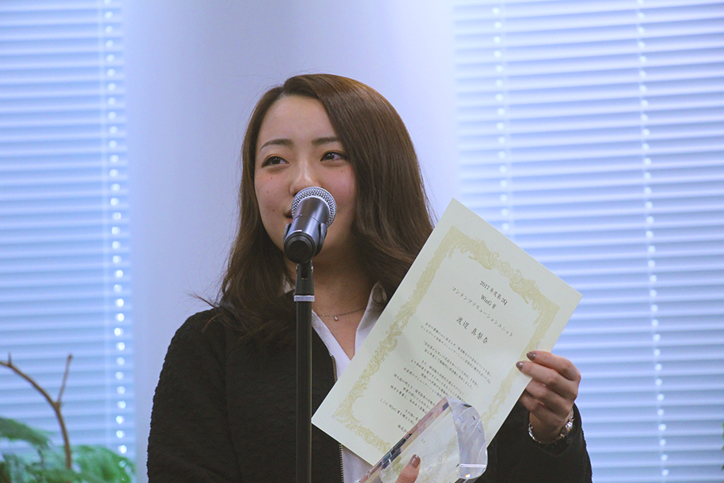 渡辺は入社したばかりで慣れない業務にも精いっぱい取り組み、それ以外にも部活動のイベント参加呼びかけなど、社内コミュニケーション活性化に尽力したことが評価され、受賞に結び付きました。