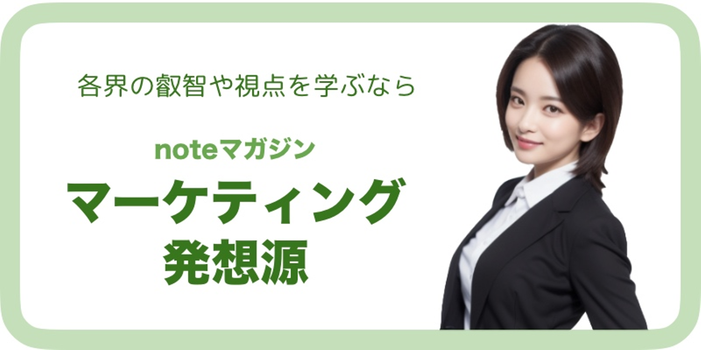 さらにnoteマガジンの「マーケティング発想源 〜経営と商売のヒント〜」では、「やりなおしマーケティング講座」「マーケティングの着想点」「教育発想源」「読書発想源」「学べるコンテンツ」「AIチャレンジャー」など、様々な業界の第一線の叡智や発想を学ぶことができます。