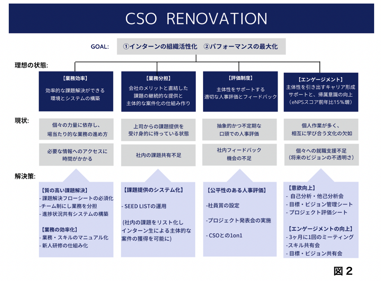 (図1右側参照)なぜこう考えたのかというと、CSOを中心に"Renovation Project"を推進することで、個人が目的意識をもち意欲高く仕事ができるようになり、個人のパフォーマンスの質が向上します。それに伴い、組織側も個人に任せられる仕事の裁量や規模が大きくなるため、CSOは個人が設定したゴールに合わせて、より裁量のある業務をアサインできるようになり、結果として個人・組織双方のパフォーマンスの最大化につながるのではないかと考えたからです。