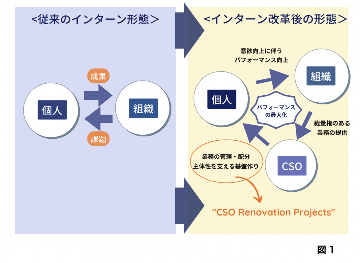そこでCSOは組織のゴールとインターン生個人のゴールをつなぐ架け橋となり、組織と個人間でシナジー効果を生むためのサポート役としての役割を担うべきではないかと考えました。