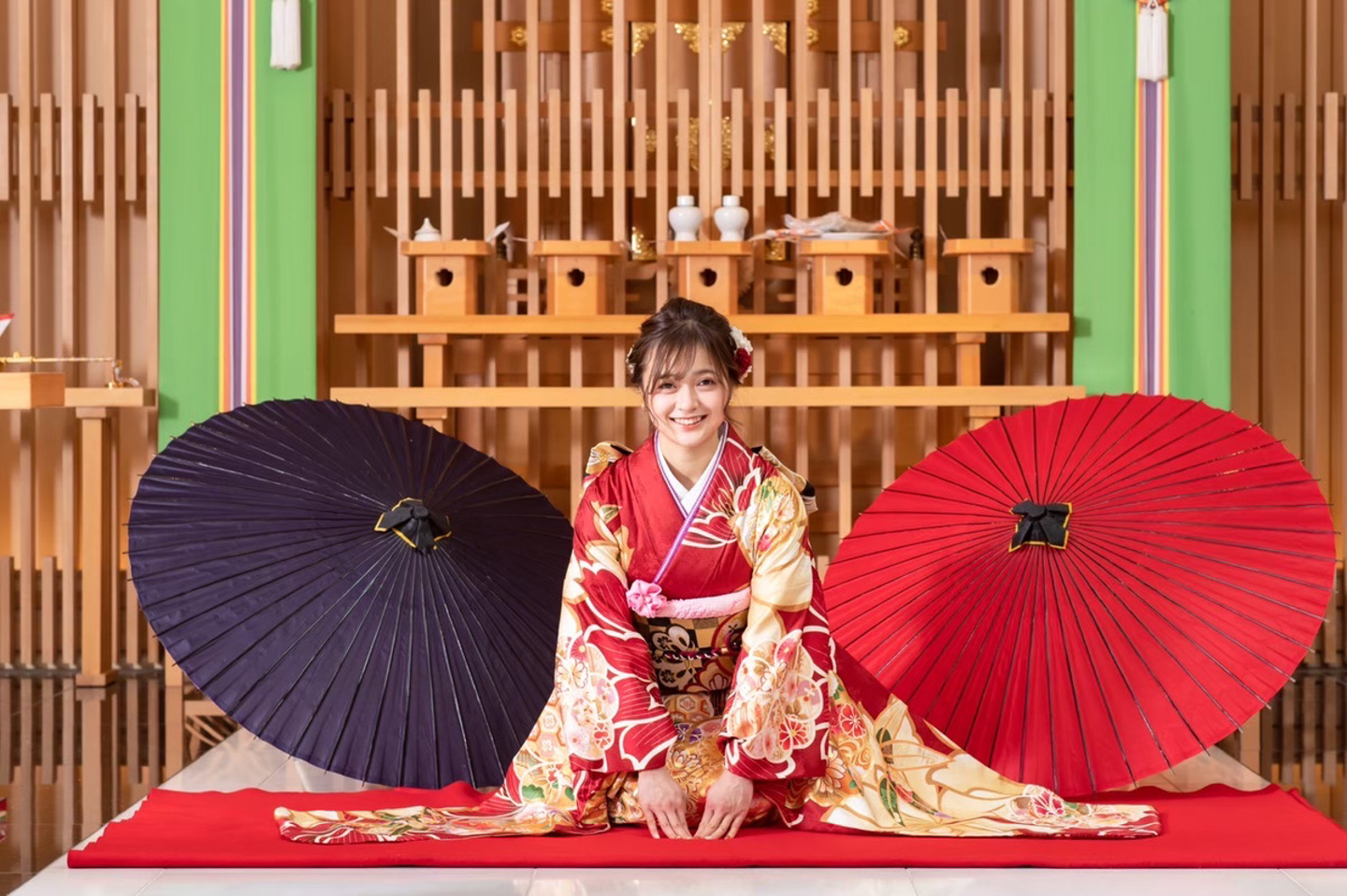 1枚目は結婚式場で撮った豪華な前撮り写真。お母さんに買ってもらった振袖で、色の決め手はみんなから絶対赤が似合うといわれていたからとのことでした!でも、被りそうだから百合の花柄をチョイス!おしゃれさんですね👀