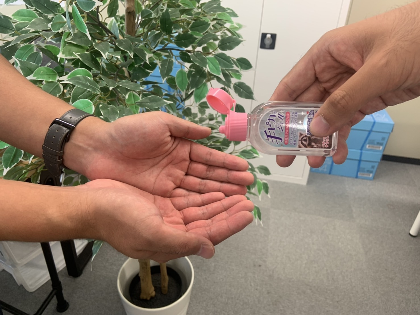 様々なウイルスが流行している中で、社内では日頃からアルコールスプレーの設置や消毒を行っております。それに加えて今回1人1個、手ピカジェルを無料でお渡ししました!