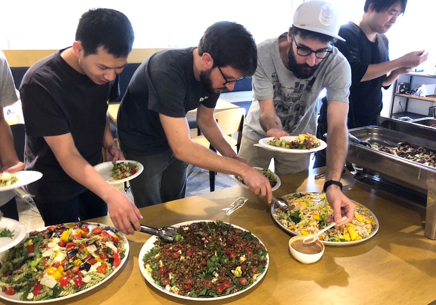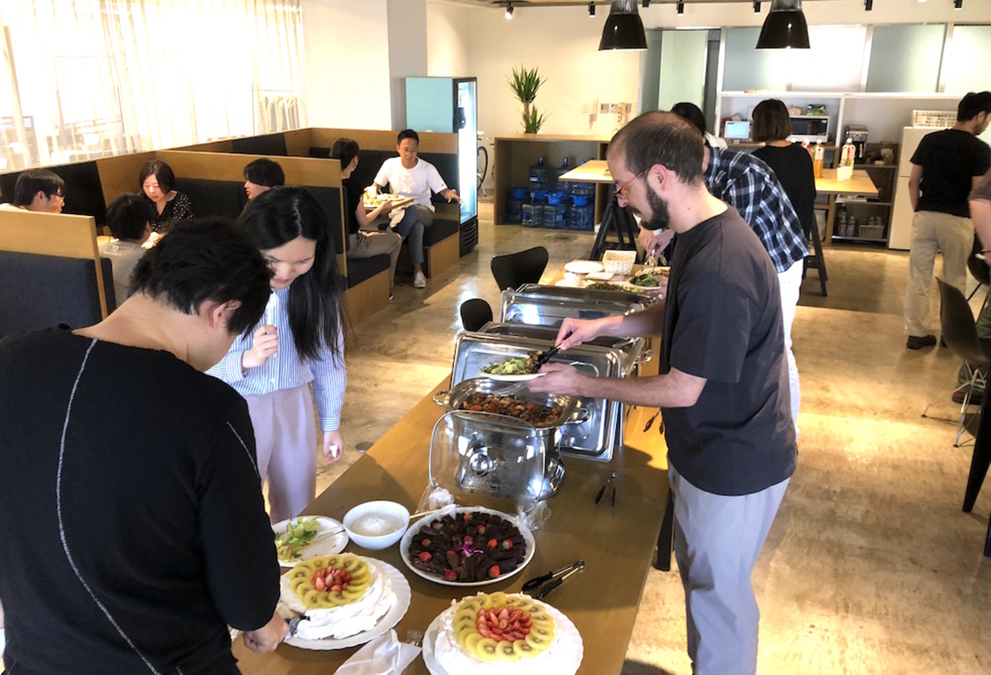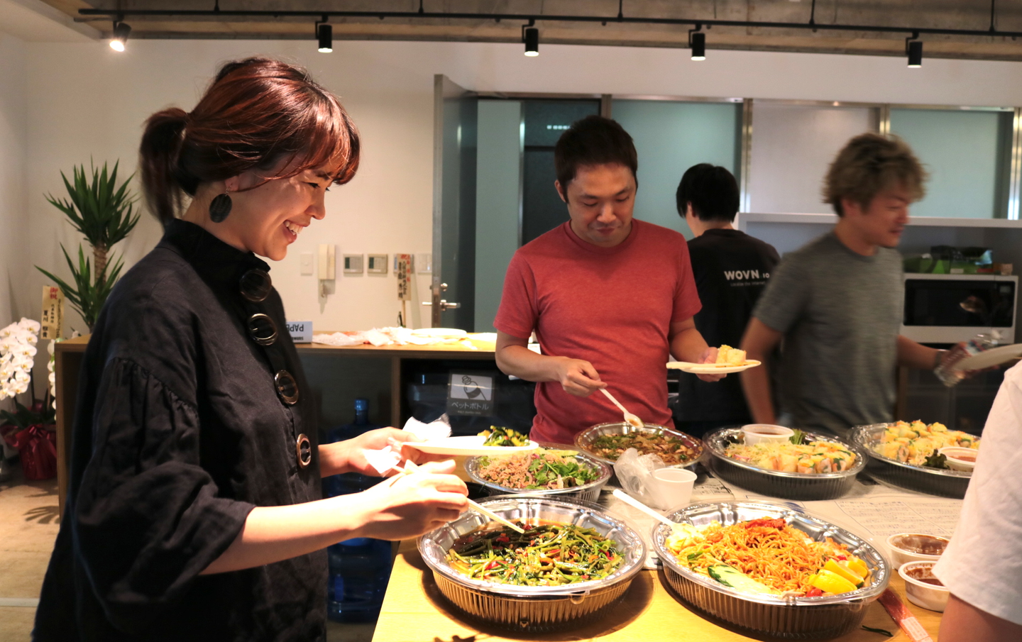オフィス真ん中のフリースペースで、普段なかなか喋らないメンバーと、仕事の話をしたり、全然関係ない話をしたり、出された料理の感想を述べたり、ひたすら食べたり、写真撮ったり・・・