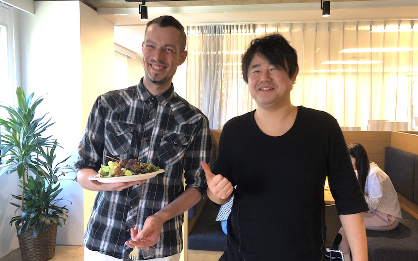 ▼5月当番だった、経営企画部長の岡ちゃん(右)と、QAエンジニアのフランソワ(左)